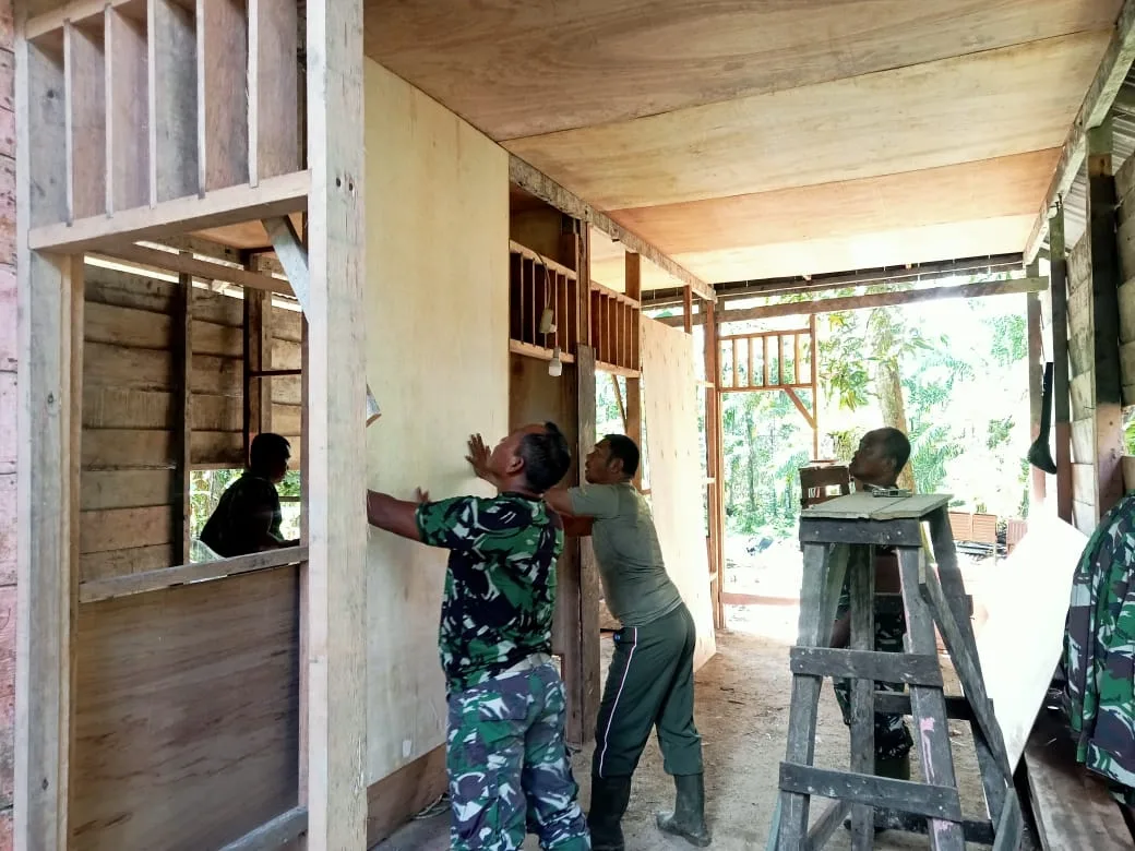 Simeulue – Personil Satgas TMMD Ke 126 Kodim 0115/Simeulue, Korem 012/Teuku Umar lanjutkan renovasi RTLH di lokasi yang dimana pemasangan Dinding dan Flafon rumah warga dalam rangka TMMD di Desa Ana’o, Kecamatan Teupah Selatan, Kabupaten Simeulue. Senin (13/10/2025).