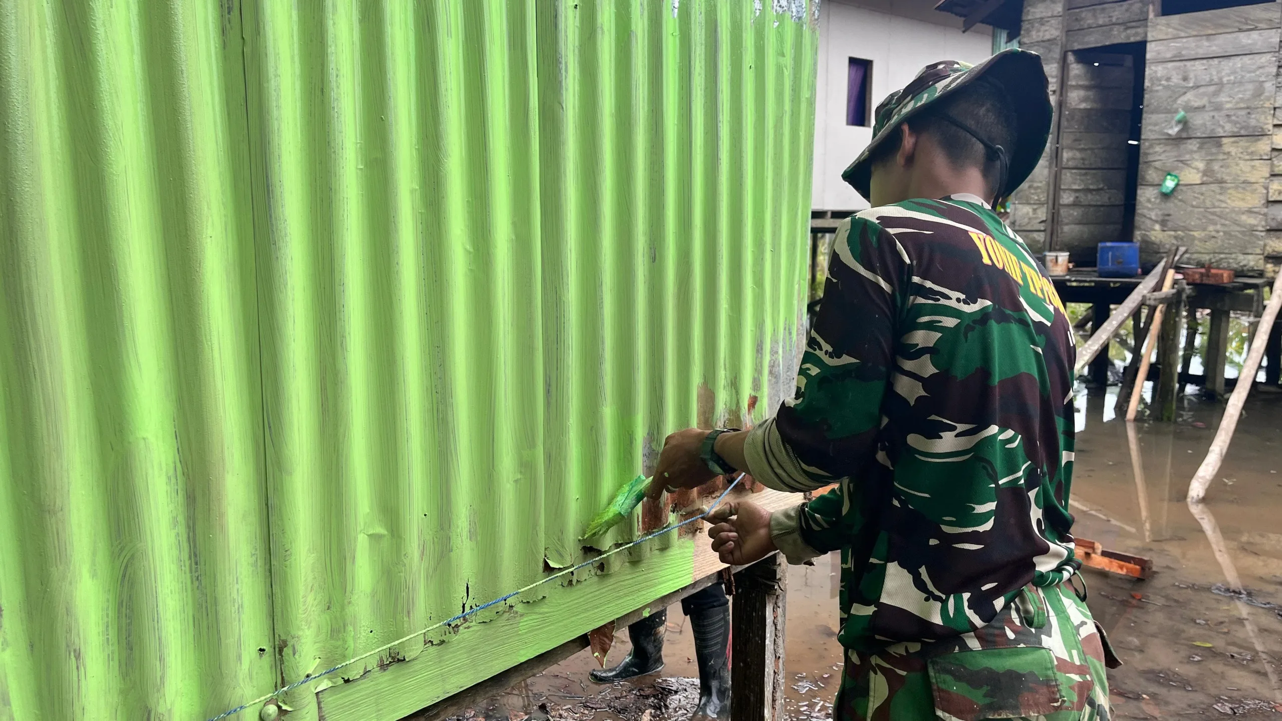 Terlihat anggota Satgas TMMD bersama masyarakat bahu-membahu melakukan pengecatan serta perbaikan bagian dinding MCK agar bangunan tersebut kembali layak digunakan. Kebersamaan antara TNI dan warga dalam proses pengerjaan ini mencerminkan semangat gotong royong yang menjadi tujuan utama dari program TMMD.