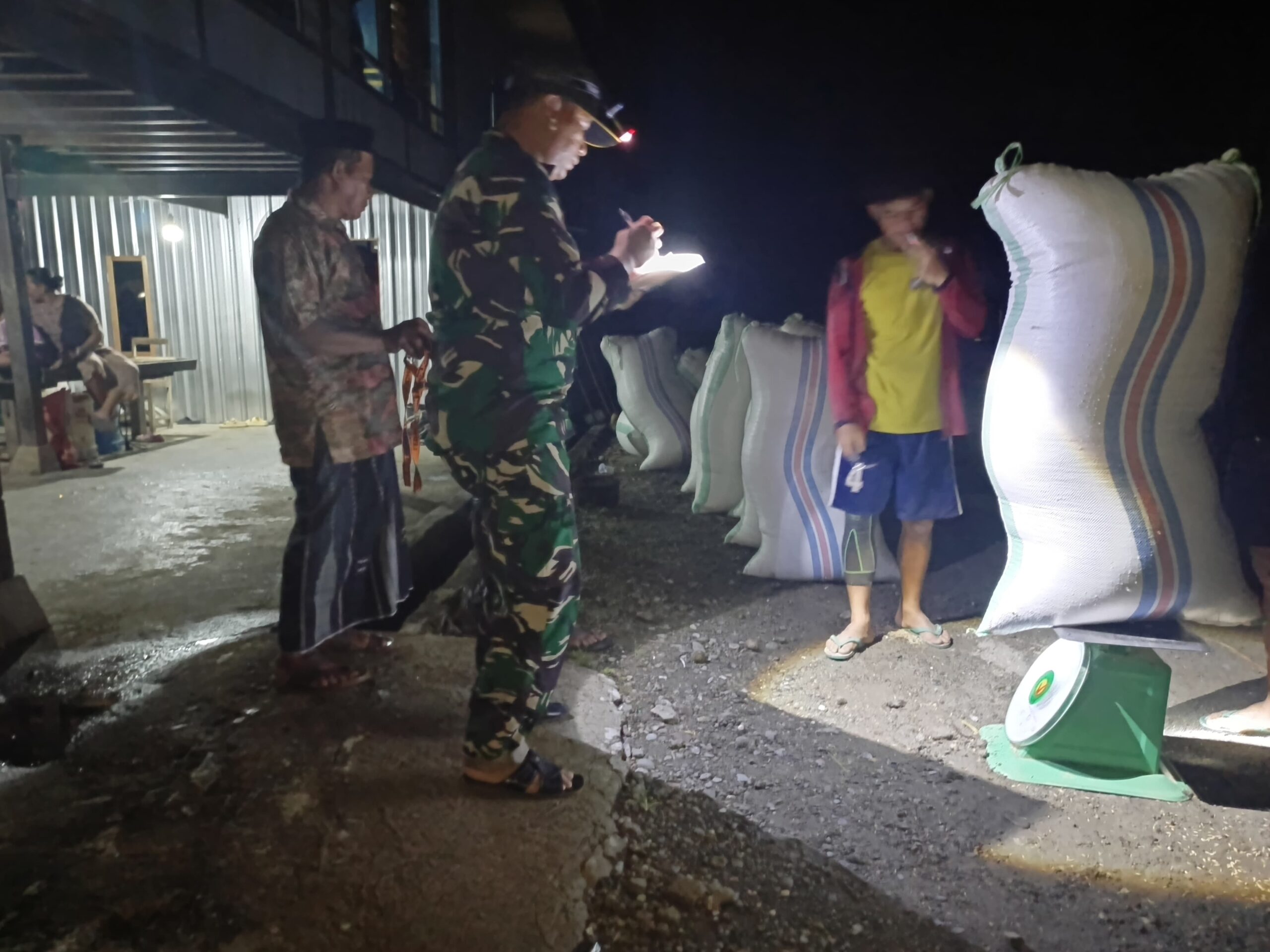 Pinrang_ Meski malam hari dan aktivitas masyarakat umumnya istrahat, semangat Babinsa Koramil-01/Suppa Kodim 1404/Pinrang Sertu Arif tak surut untuk mendampingi kegiatan penyerapan gabah petani oleh penggiling mitra Bulog di Desa Polewali Kecamatan Suppa Kabupaten Pinrang dengan harga Rp 6.500′- perkilogram, Jum’at (09/05/2025).