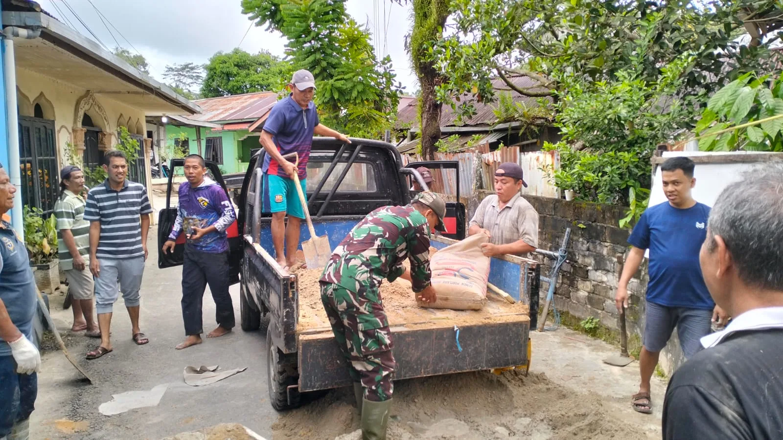 Dengan penuh semangat Kebersamaan antara Babinsa dan masyarakat terlihat sangat kompak saat menggarap perbaikan jalan dan parit yang rusak akibat longsor mewujudkan terciptanya kemanunggalan TNI dan rakyat.
