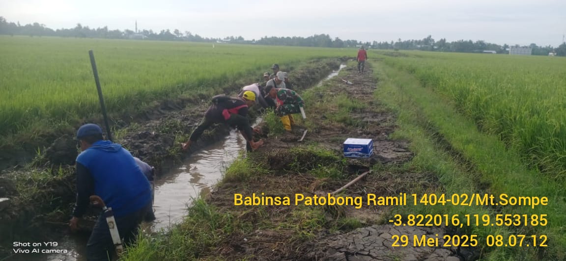 Pinrang_ Agar air lancar mengairi persawahan, Babinsa Koramil-02/Mattiro Sompe Kodim 1404/Pinrang Serka Mustaming bersama warga melaksanakan kerja bakti pembersihan saluran irigasi di persawahan Dusun Tanete Desa Patobong Kecamatan Mattiro Sompe Kabupaten Pinrang, Jum’at (30/05/2025).