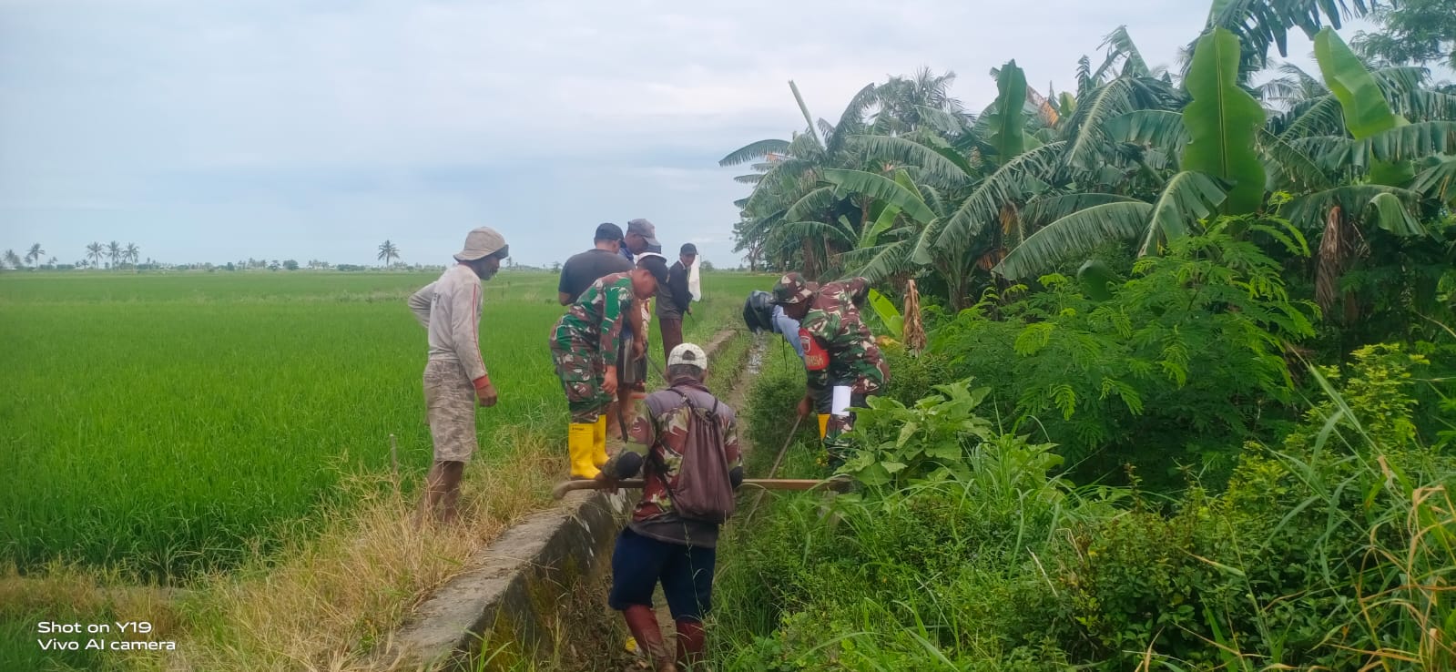 Pinrang_ Untuk mendukung kebutuhan air bagi para petani, Babinsa jajaran Koramil-02/Mattiro Sompe Kodim 1404/Pinrang bersama warga membersihkan saluran irigasi pengairan di Dusun Katteong Desa Samaenre Kecamatan Mattiro Sompe Kabupaten Pinrang, Sabtu (12/04/2025).