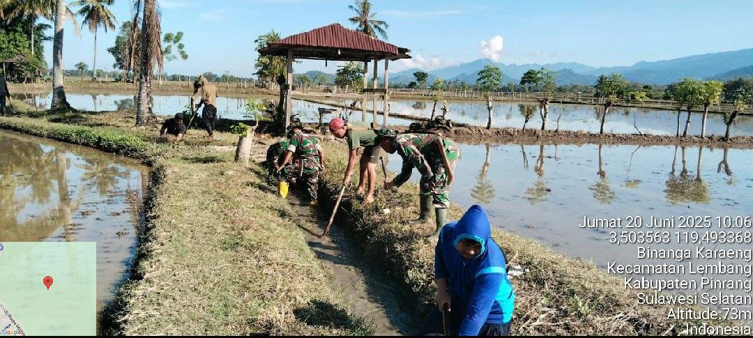 Pinrang_ Untuk membantu kelancaran dalam pengolahan lahan pertanian serta mendukung kebutuhan air persawahan petani, Babinsa jajaran Koramil 07/Lembang Kodim 1404/Pinrang bersama warga membersihkan saluran irigasi pengairan menuju arah kesawah di Dusun Pajalele Desa Binangakaraeng Kecamatan Lembang Kabupaten Pinrang, Jum’at (20/06/2025).
