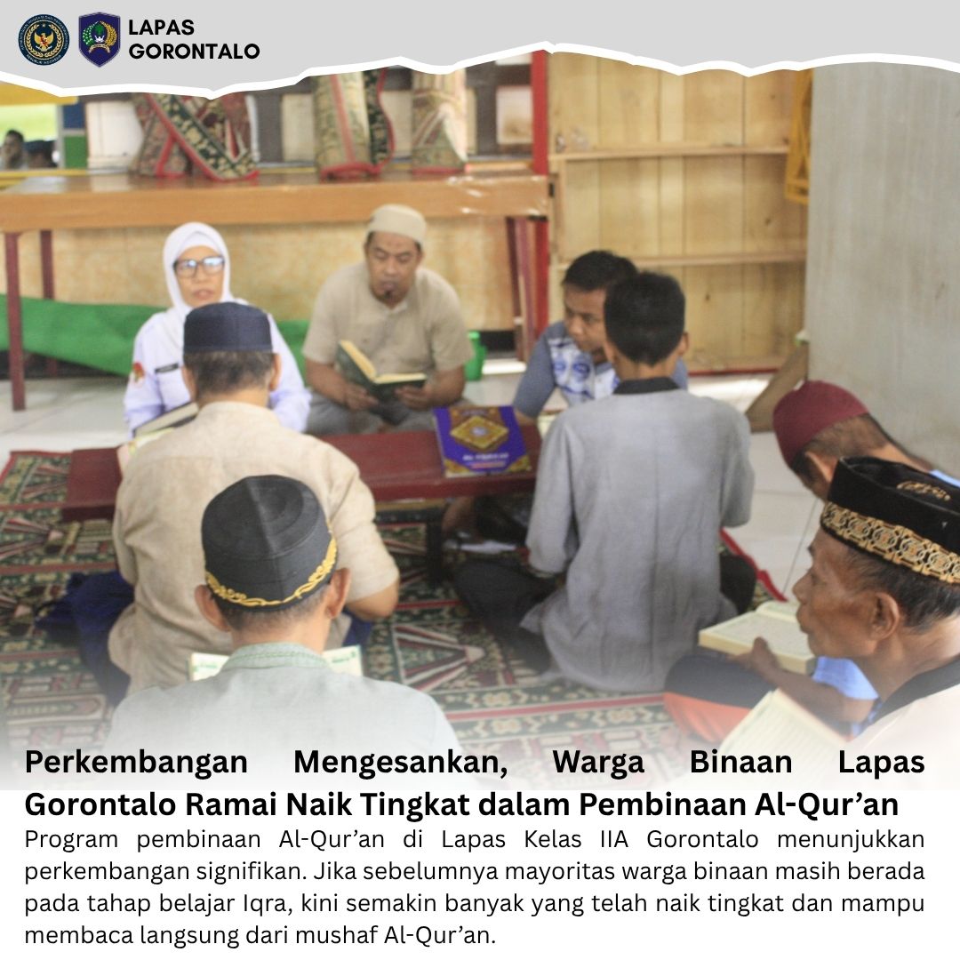 Gorontalo – INFO_PAS – Program pembinaan Al-Qur’an di Lapas Kelas IIA Gorontalo menunjukkan perkembangan signifikan. Jika sebelumnya mayoritas warga binaan masih berada pada tahap belajar Iqra, kini semakin banyak yang telah naik tingkat dan mampu membaca langsung dari mushaf Al-Qur’an.