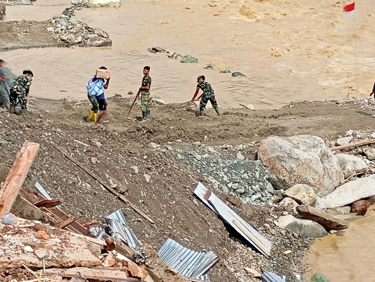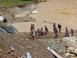Nagan Raya, Personil Posramil Beutong Ateu Benggalang bersama dengan Yon TP 856 /SBS dan Masyarakat terus melakukan pengisisan Batu ke bronjong untuk memperkuat samping kanan kiri Jembatan Darurat agara kokoh dan tidak mudah terkikis arus air di kecamatan Beutong Ateuh Benggalang Kabupaten Nagan Raya, Senin (15/12/2025)