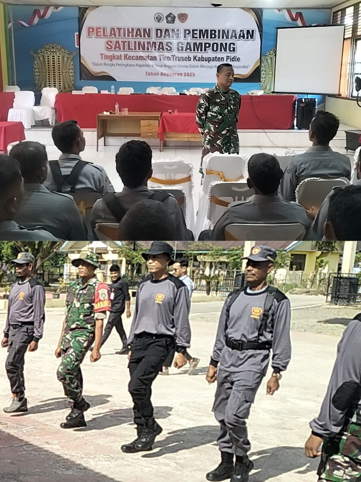 Pidie — Dalam rangka meningkatkan kualitas sumber daya manusia sekaligus memperkuat ketahanan wilayah di tingkat desa, anggota Koramil 15/Tiro Kodim 0102/Pidie bersama Polsek Tiro melaksanakan pelatihan dan pembinaan Satuan Perlindungan Masyarakat (Satlinmas) Gampong se-Kecamatan Tiro/Truseb. Kegiatan ini berlangsung di halaman Mapolsek Tiro, Desa Mancang, Kecamatan Tiro, Kabupaten Pidie, Rabu (09/07/2025).
