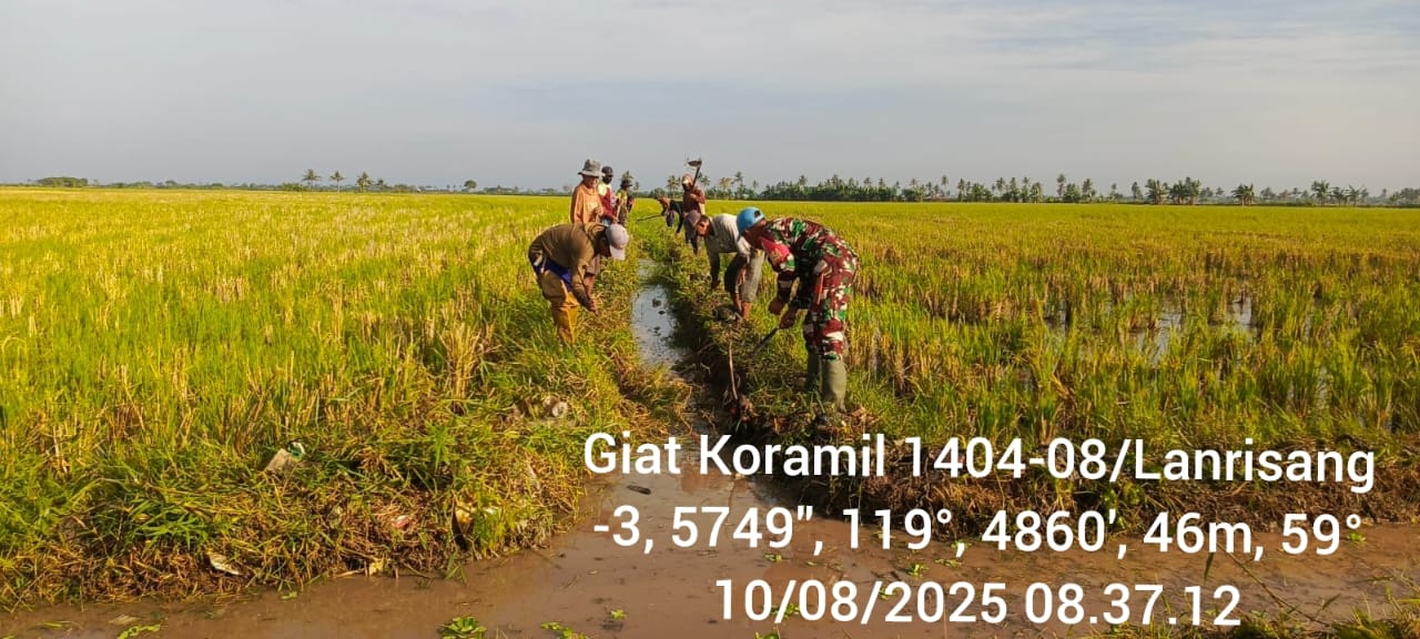Pinrang_ Untuk memenuhi kebutuhan air persawahan, Babinsa jajaran Koramil-08/Lanrisang Kodim 1404/Pinrang melaksanakan kerja bakti bersama warga pembersihan saluran irigasi guna mendukung proses persiapan turun sawah memasuki musim tanam di Lingkungan Kassi kelurahan Lanrisang Kecamatan Lanrisang Kabupaten Pinrang, Minggu (10/08/2025).