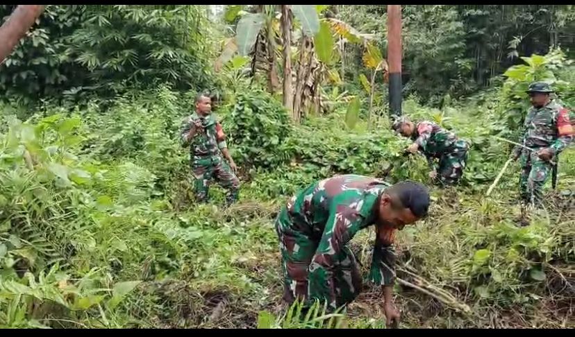 Personil Kodim 1502/Masohi Melaksanakan Pembersihan Lahan yang nantinya akan di laksanakan pembangunan pos pengamanan paska bentrokan Negeri Sawak dan Masihulan Kec. Seram Utara Kab. Maluku Tengah. Minggu (06/04/2025).