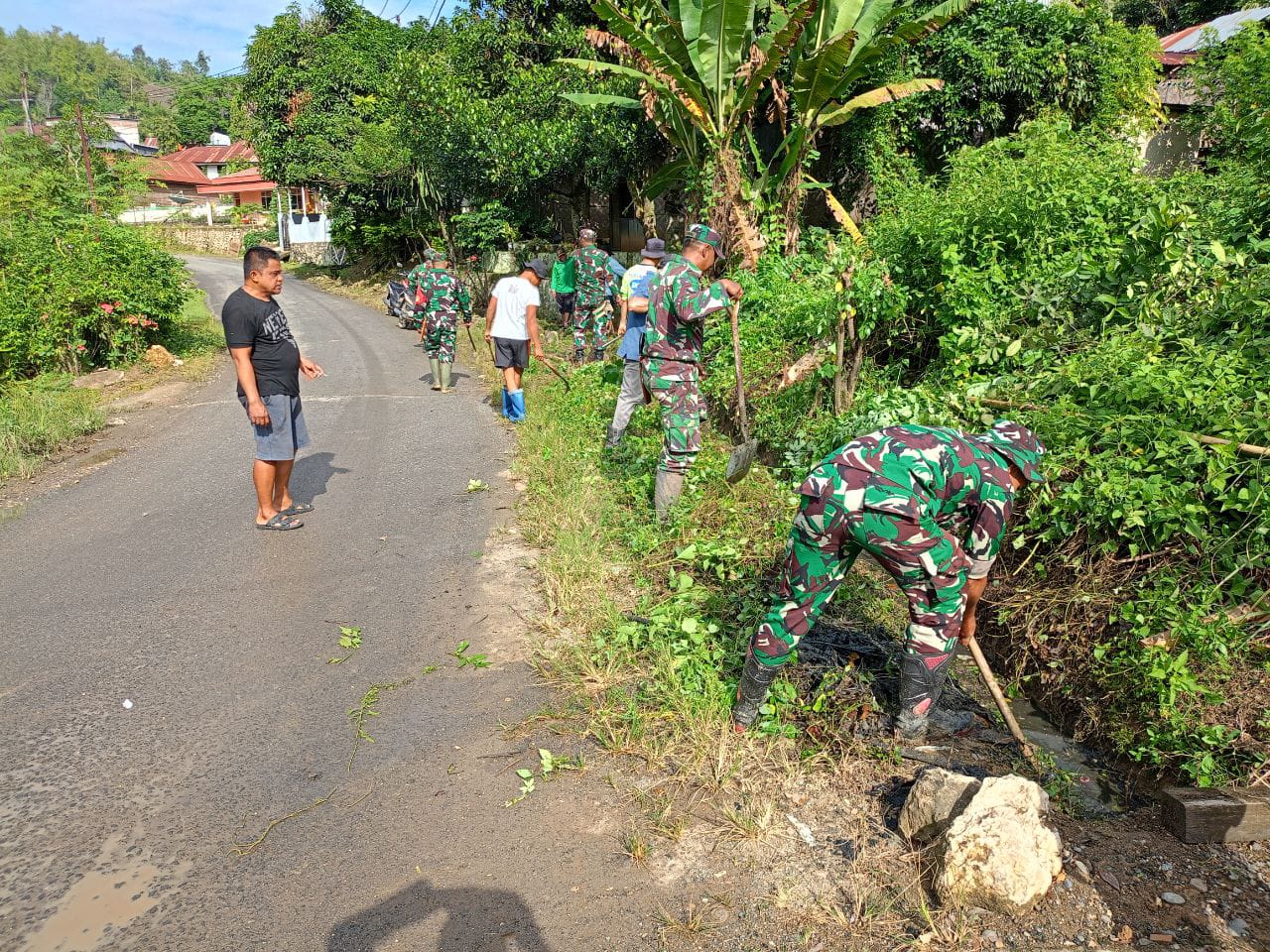 Enrekang – Anggota Koramil 1419-03/Baraka di pimpin Peltu Arsyad Melaksanakan karya bakti pembersihan selokan dari tanah, rumput dan sampah lainnya sepanjang 150 meter di Dusun Matarim Desa Salukanan Kec. Baraka Kab. Enrekang, Kamis (19/06/2025)