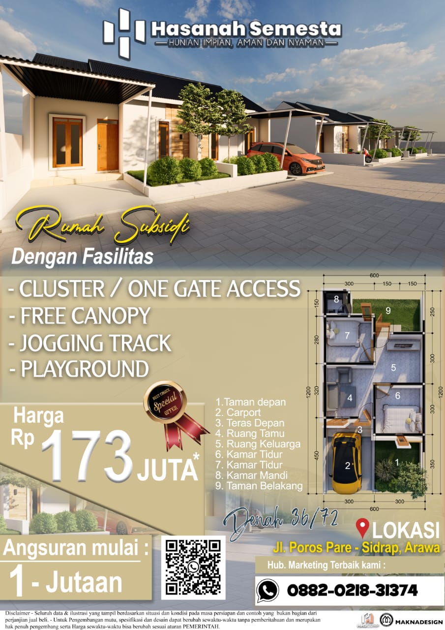 Onwer Perumahan Hasanah Semesta, Rahmat mengatakan perumahan ini menawarkan rumah subsidi Type 36/72 yang sudah siap huni, dilengkapi dengan 2 kamar tidur, 1 kamar mandi, 1 carport, ruang tamu, ruang keluarga, listrik 1.300 watt, serta sumber air dari sumur bor atau PDAM.