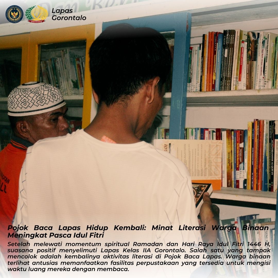 Gorontalo_Senin (06/04) – Setelah melewati momentum spiritual Ramadan dan Hari Raya Idul Fitri 1446 H, suasana positif menyelimuti Lapas Kelas IIA Gorontalo. Salah satu yang tampak mencolok adalah kembalinya aktivitas literasi di Pojok Baca Lapas. Warga binaan terlihat antusias memanfaatkan fasilitas perpustakaan yang tersedia untuk mengisi waktu luang mereka dengan membaca.