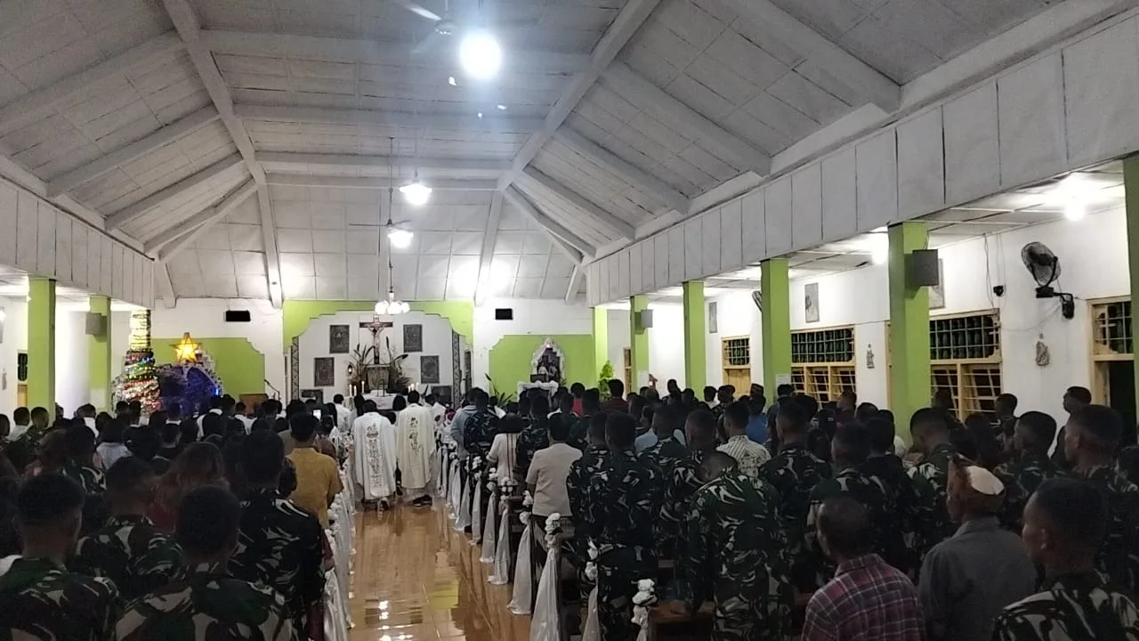 Sebanyak 200 personel prajurit Brigif TP/ 31/ Perisai Sakti mengikuti rangkaian Misa dan Malam Natal bersama umat di Gereja Santa Maria Yosef, Kabupaten Dompu, pada Selasa malam (24/12/2025). Kegiatan ini berlangsung hikmat dan penuh kedamaian, mencerminkan komitmen TNI dalam menjaga toleransi, kerukunan, serta mempererat hubungan dengan masyarakat.