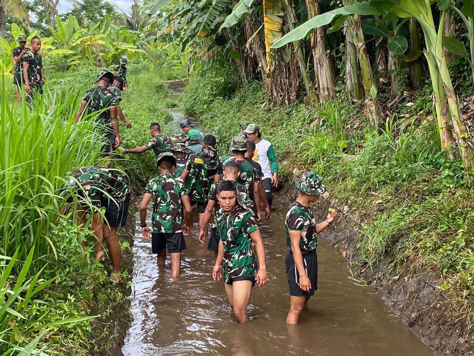 Sejak pagi, prajurit dan warga bergotong-royong menyisir sepanjang bantaran sungai untuk mengangkat sampah, ranting, serta gulma yang menghambat aliran air.