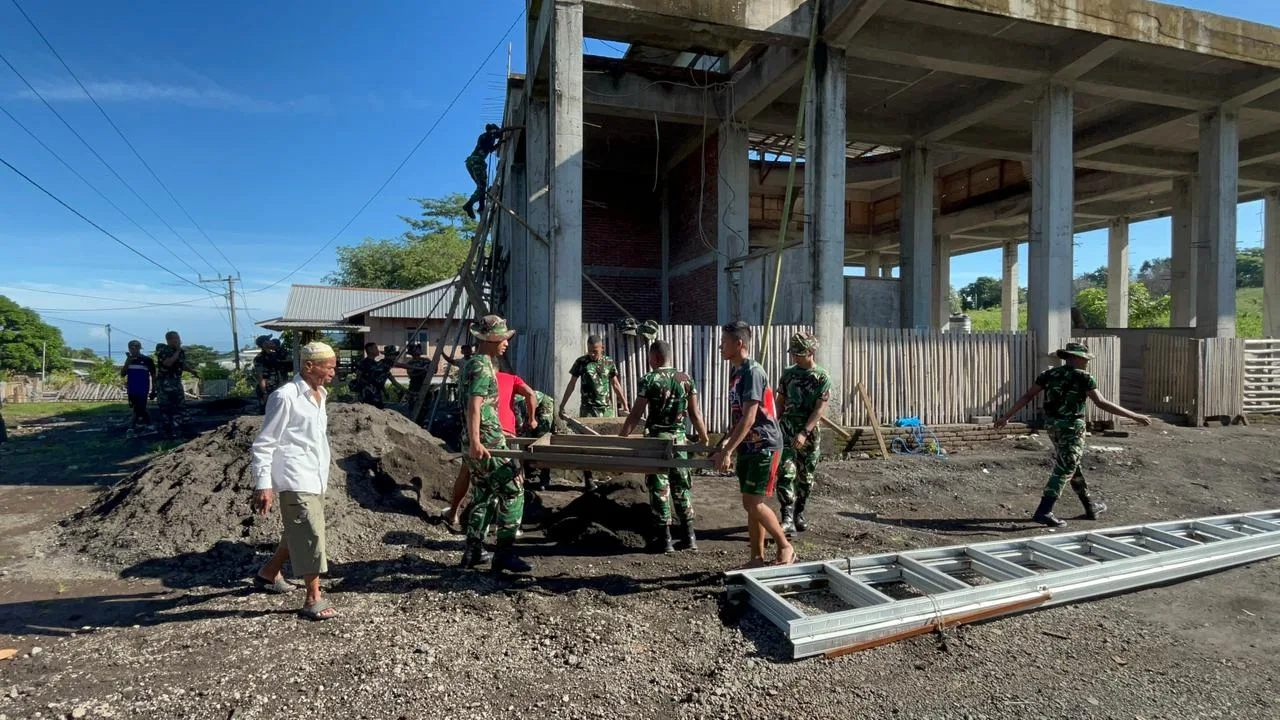 Dalam proses pengerjaan, para prajurit membagi tugas mulai dari pengadukan material, pengangkutan semen, pemasangan rangka baja ringan hingga penataan atap. Kerja sama yang solid membuat proses pengecoran berjalan cepat dan rapi, sekaligus memastikan struktur bangunan memiliki kualitas yang kuat dan aman.