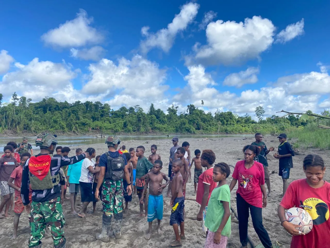 Nduga, Papua – Dalam rangka mempererat kedekatan dengan masyarakat serta meningkatkan kualitas hidup anak-anak, prajurit Satgas Pamtas Mobile Yonif 733/Masariku Titik Kuat Batas Batu melaksanakan kegiatan olahraga bersama dan edukasi hidup bersih di Kampung Mumugu, Distrik Krepkuri, Kabupaten Nduga.