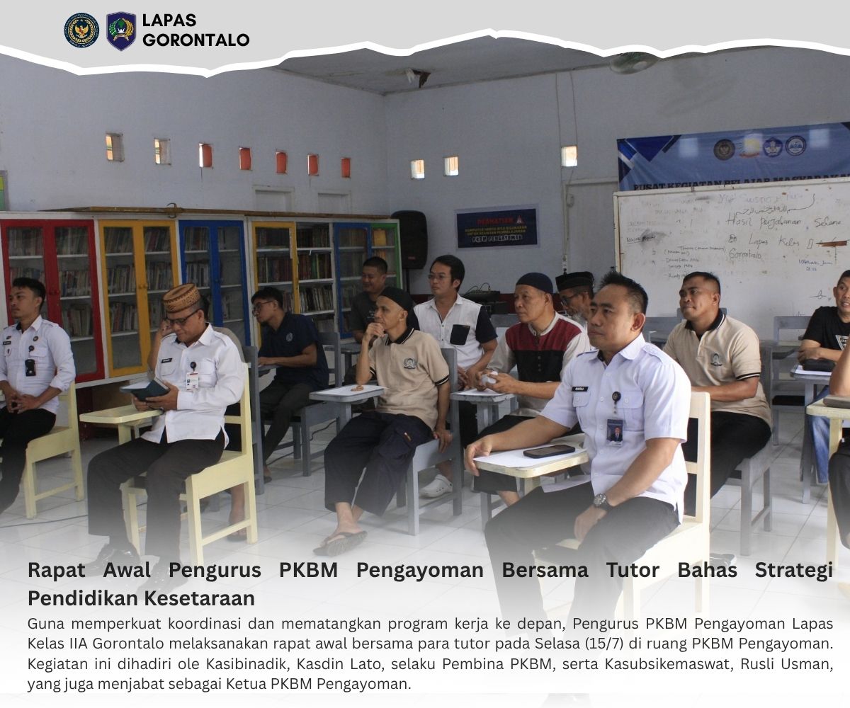 Gorontalo – INFO_PAS – Guna memperkuat koordinasi dan mematangkan program kerja ke depan, Pengurus PKBM Pengayoman Lapas Kelas IIA Gorontalo melaksanakan rapat awal bersama para tutor pada Selasa (15/7) di ruang PKBM Pengayoman. Kegiatan ini dihadiri ole Kasibinadik, Kasdin Lato, selaku Pembina PKBM, serta Kasubsikemaswat, Rusli Usman, yang juga menjabat sebagai Ketua PKBM Pengayoman.