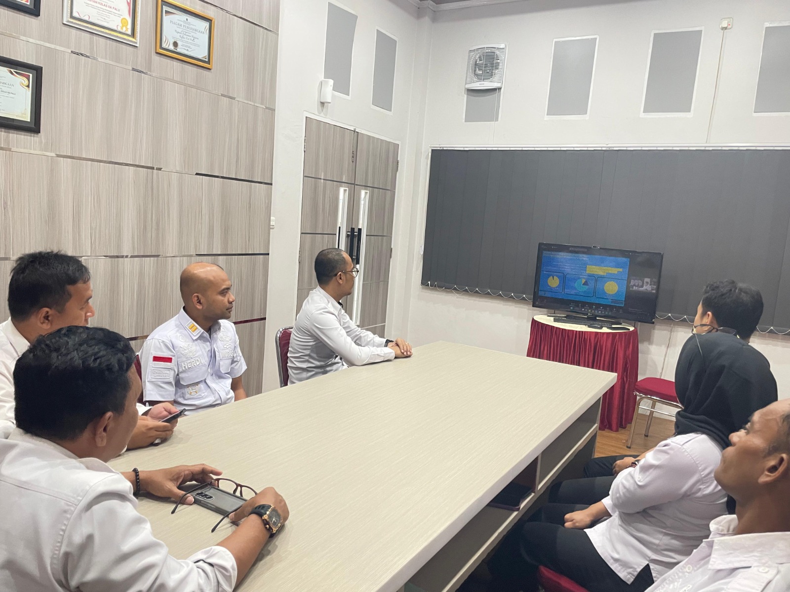 Kepala Rutan Palu, Yansen, mengikuti rapat tersebut bersama para pejabat strukturalnya di ruangan rapat rutan.