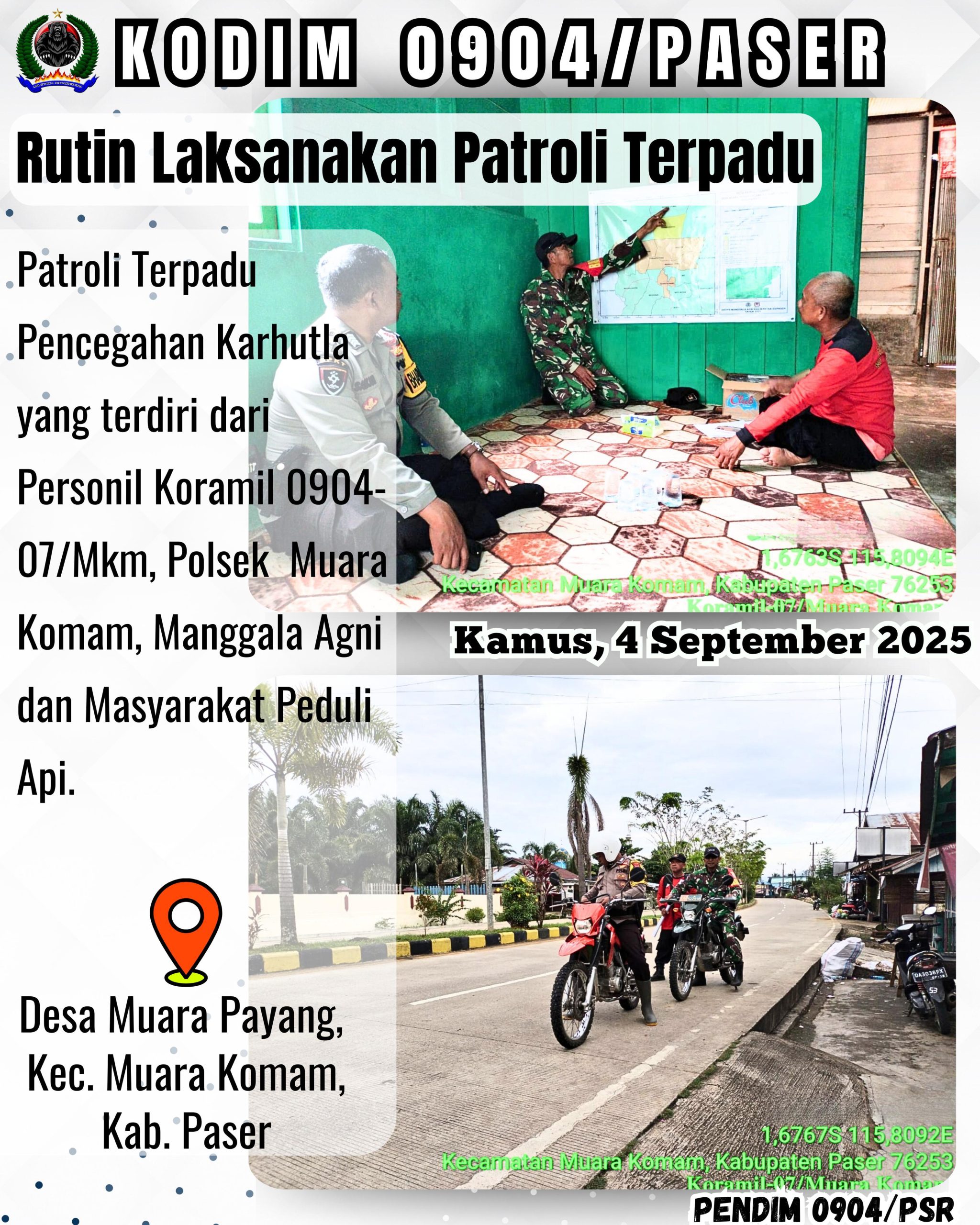 Kodim 0904/Psr, Korem 091/ASN, Kodam VI/Mlw – Patroli Terpadu Pencegahan Karhutla yang terdiri dari Personil Koramil 0904-07/Mkm, Polsek Muara Komam, Manggala Agni dan Masyarakat Peduli Api, Kamis (4/9/2025).