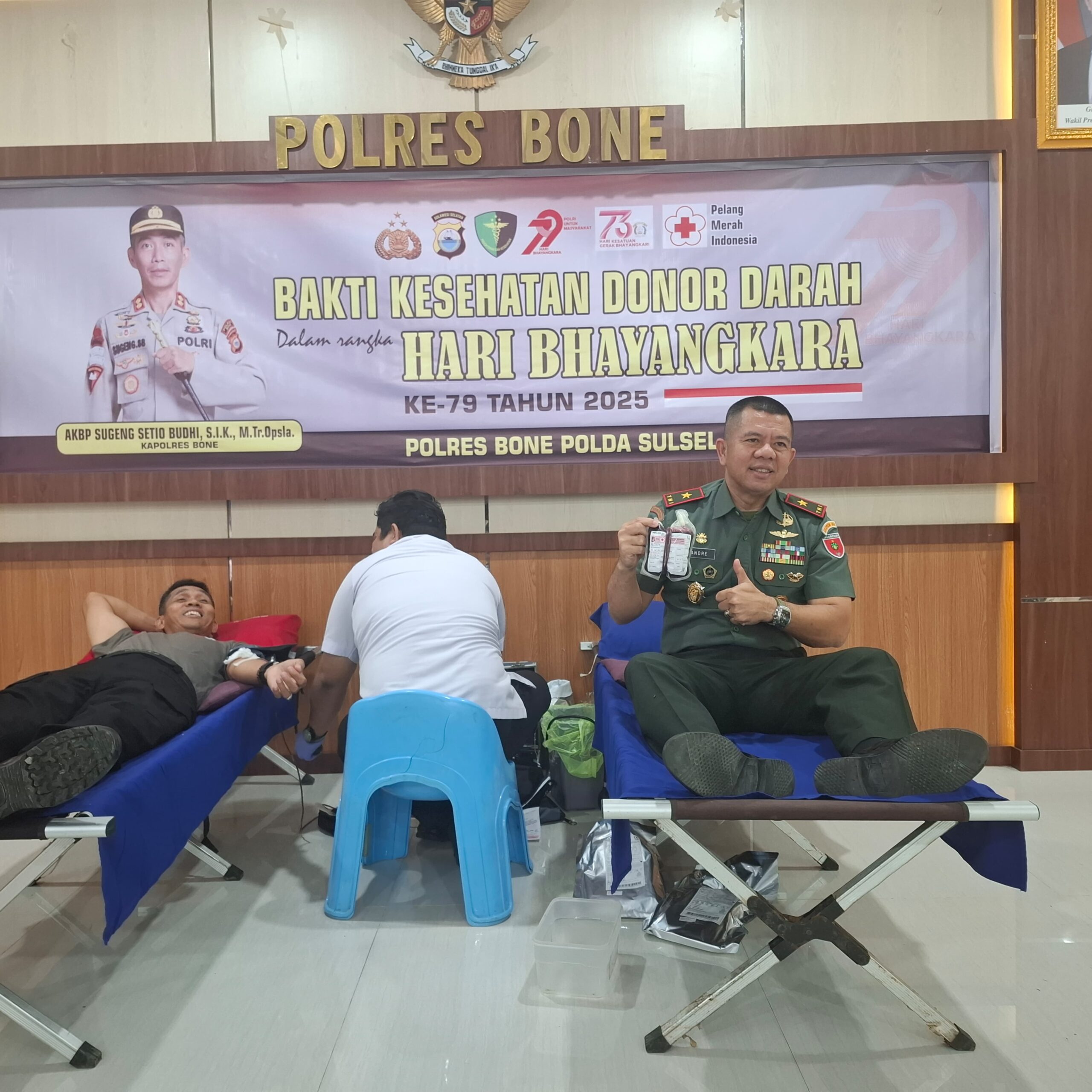 Watampone – Memperingati HUT Bhayangkara Ke-79 Tahun 2025, Komandan Korem 141/Tp Brigjen TNI Andre Clift Rumbayan, S.Sos., M.M. hadiri dan ikut mendonorkan darahnya langsung pada acara Bakti Kesehatan Donor Darah bertempat di Aula Sarja Arya Racana Mapolres Bone Jl. Yos Sudarso Kel. Tibojong, Kec. Tanete Riattang Timur, Kab. Bone Sul-Sel. Kamis (19/06/2025)