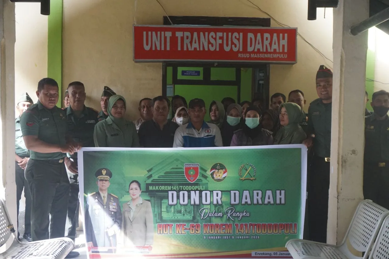 Dalam rangka menyambut Hari Ulang Tahun (HUT) ke-69 Korem 141/Toddopuli, Kodim 1419/Enrekang menggelar kegiatan bakti sosial donor darah dengan tema “Teguh Dalam Keyakinan”. Kegiatan tersebut dilaksanakan di Unit Transfusi Darah (UTD) RSUD Massenrempulu, Jl. Jenderal Sudirman, Kelurahan Galonta, Kecamatan Enrekang, Kabupaten Enrekang, Senin (05/01/2026).