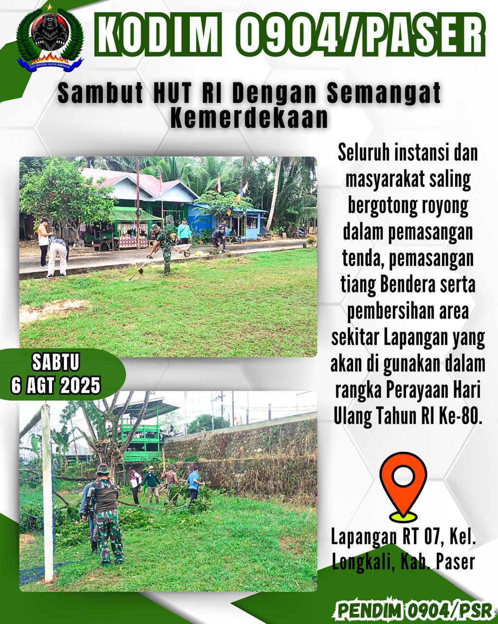 Kodim 0904/Psr, Korem 091/ASN, Kodam VI/Mlw – Danramil 0904-04/Long Kali beserta anggota mengikuti kegiatan Gotong Royong dalam rangka Menyambut Hari Kemerdekaan Republik Indonesia Ke-80 Tahun 2025 yang bertempat di Lapangan RT 07, Kelurahan Longkali, Kec. Long Kali, Kab. Paser, Sabtu (9/8/2025).