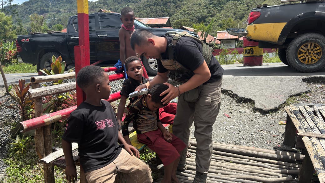 Puncak Jaya, Personel Satuan Tugas (Satgas) Tindak Operasi Damai Cartenz 2025 menggelar kegiatan sosial berupa layanan cukur rambut gratis bagi anak-anak di Distrik Mulia, Kabupaten Puncak Jaya, Papua Pegunungan, pada Rabu (23/4/2025).