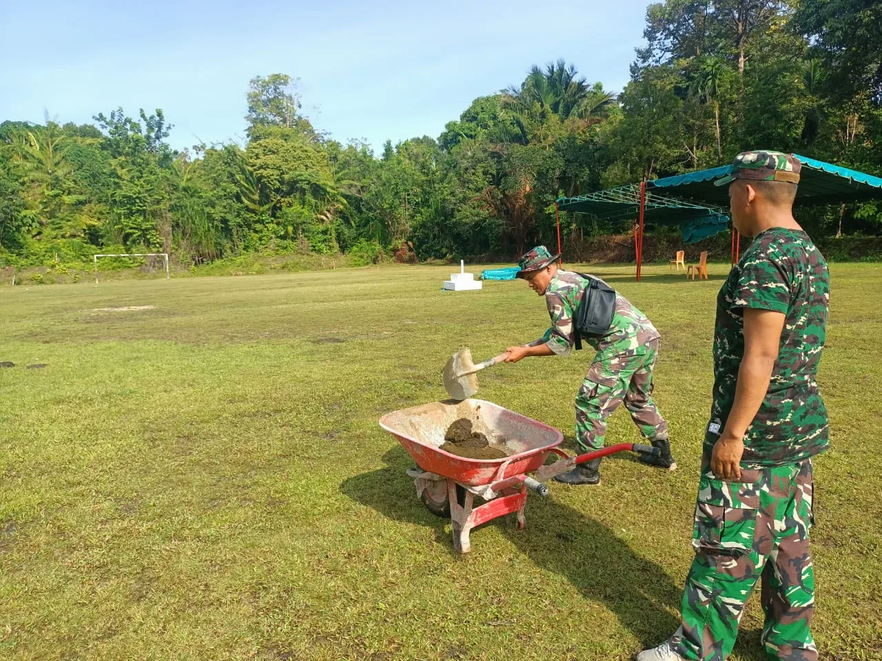 Selain personel Satgas TMMD, kegiatan gotong royong ini juga melibatkan warga setempat. Mereka bekerja sama untuk mematangkan persiapan sebelum acara penutupan TMMD yang dijadwalkan.