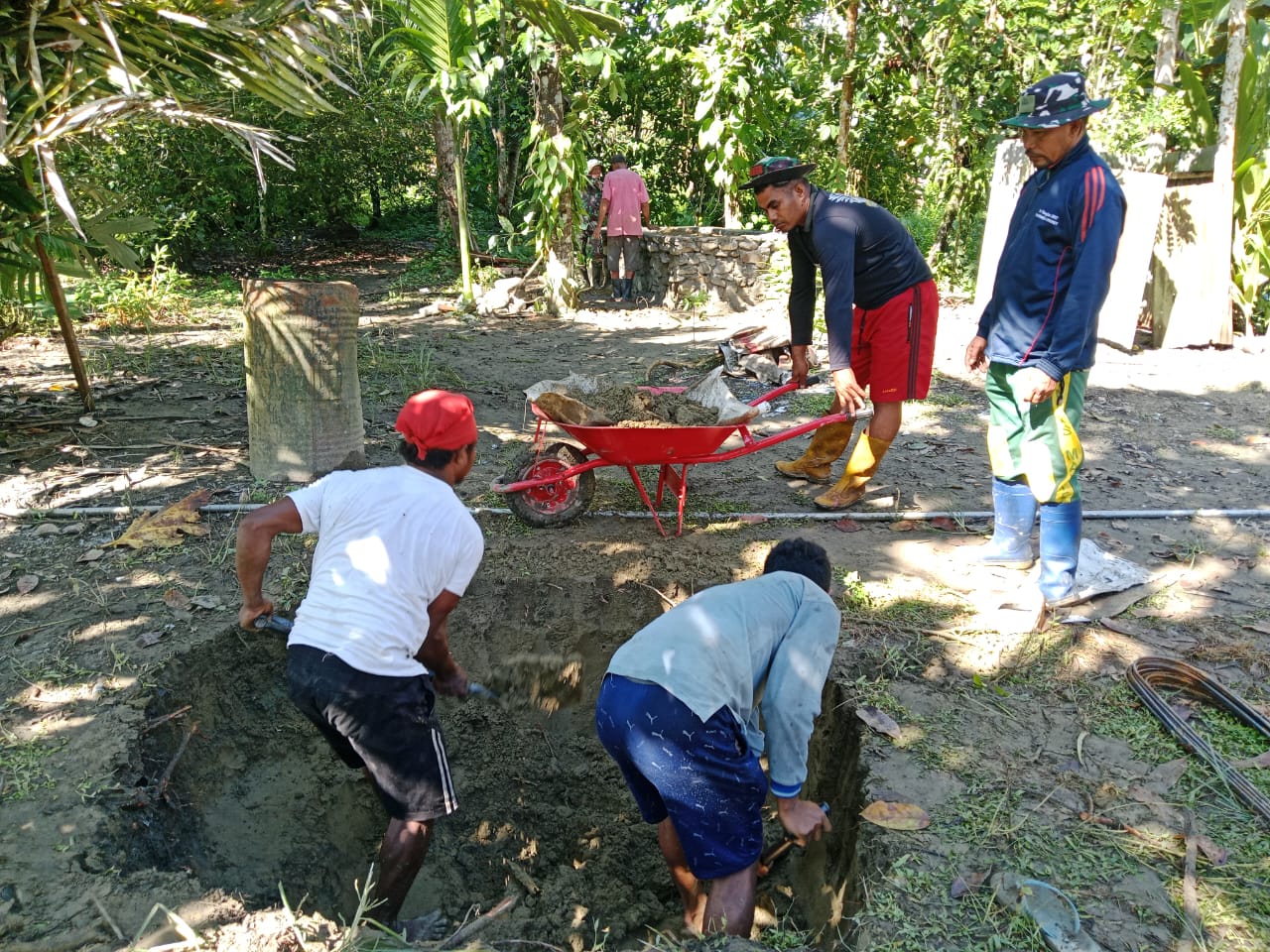 Personil Satgas TMMD ke 124 Kodim 1502/Masohi bersama dengan masyarakat menggali septic tank MCK yang berada di Desa Waraka Kec. Teluk Elpaputih Kab. Maluku Tengah. Selasa (13/05/2025).
