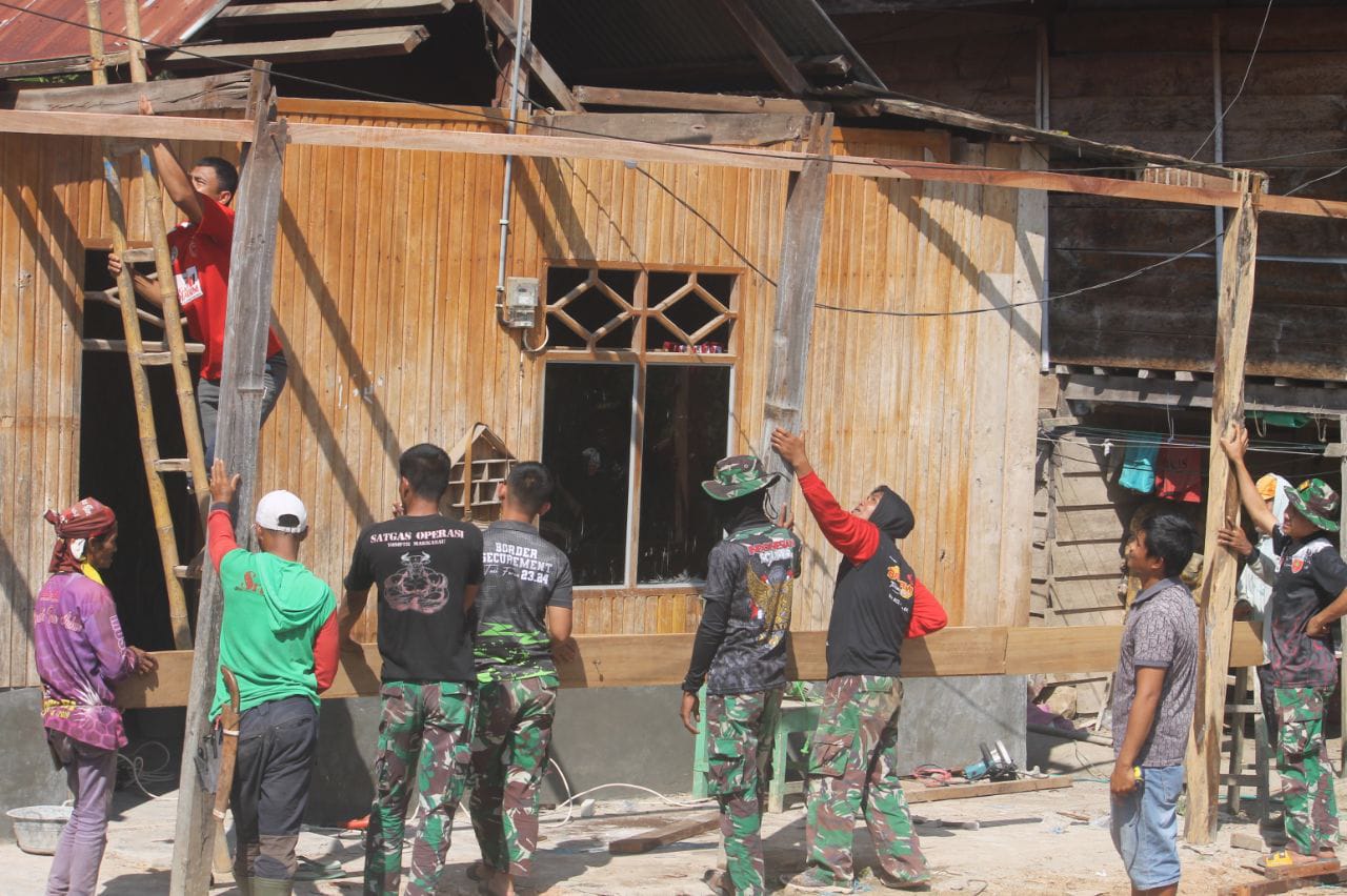 Personel Satgas bersama warga setempat melanjutkan proses pekerjaan RTLH yang kini memasuki 60% tahapan penyesuaian struktur dan pemasangan Atap.