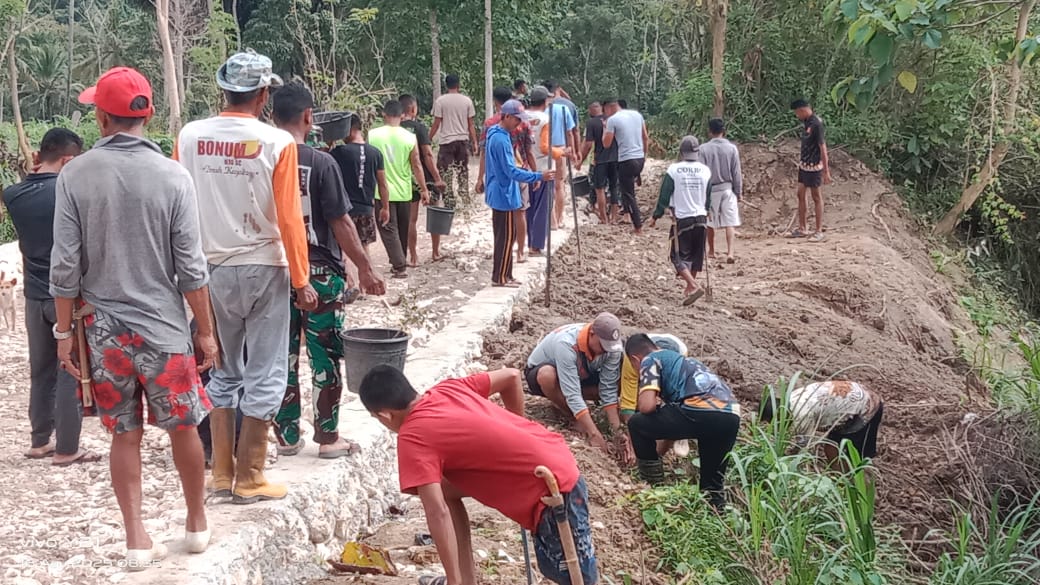 Silih berganti bahu membahu personel TNI POLRI bersama masyarakat membuat lubang untuk penanaman bibit pohon katapan cina dan pohon jati putih, disepanjang pengerasan jalan TMMD untuk mengurangi dampak pemanasan global, menambah sumber oksigen, menyimpan air dalam tanah, menyerap polusi udara, memperindah lingkungan, mencegah banjir dan mencegah erosi.