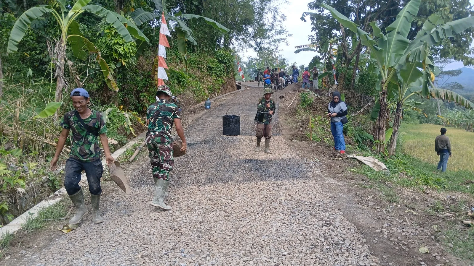 Sukabumi — Proses pengaspalan jalan sepanjang 680 meter mulai dilaksanakan oleh Satgas TNI Manunggal Membangun Desa (TMMD) ke-127 Kodim 0607/Kota Sukabumi. Kegiatan ini diawali dengan tahapan pemadatan permukaan jalan menggunakan setom sebagai dasar agar hasil pengaspalan lebih kuat dan tahan lama.