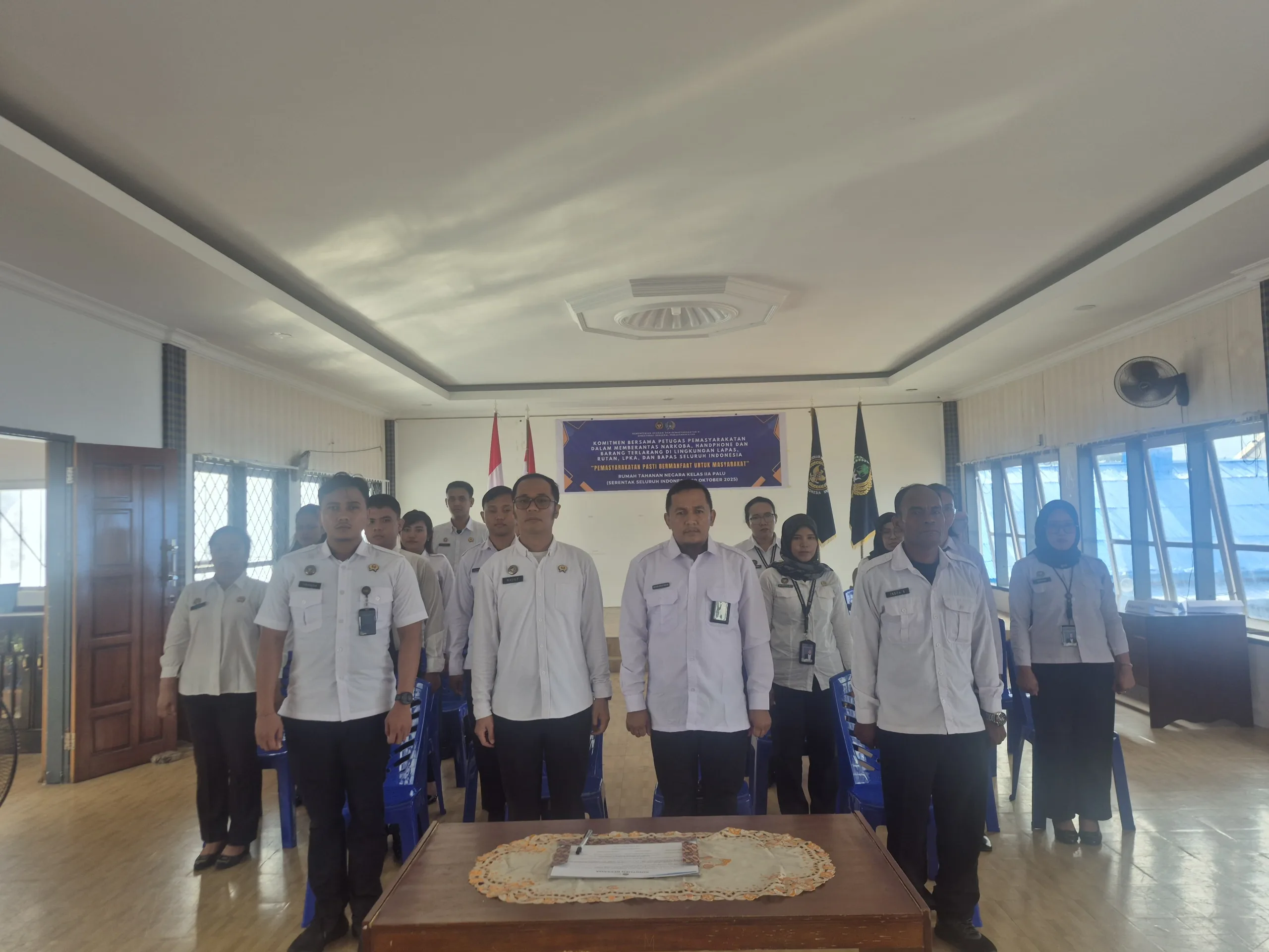 Seluruh pejabat dan petugas Rutan Palu mengikuti prosesi penandatanganan di Aula Pogombo Rutan dengan dipimpin oleh Kepala Kesatuan Pengamanan Rutan (Ka.KPR) Rutan Palu, Muhammad Rias, selaku Plh. Kepala Rutan Kelas IIA Palu, Fani Andika.