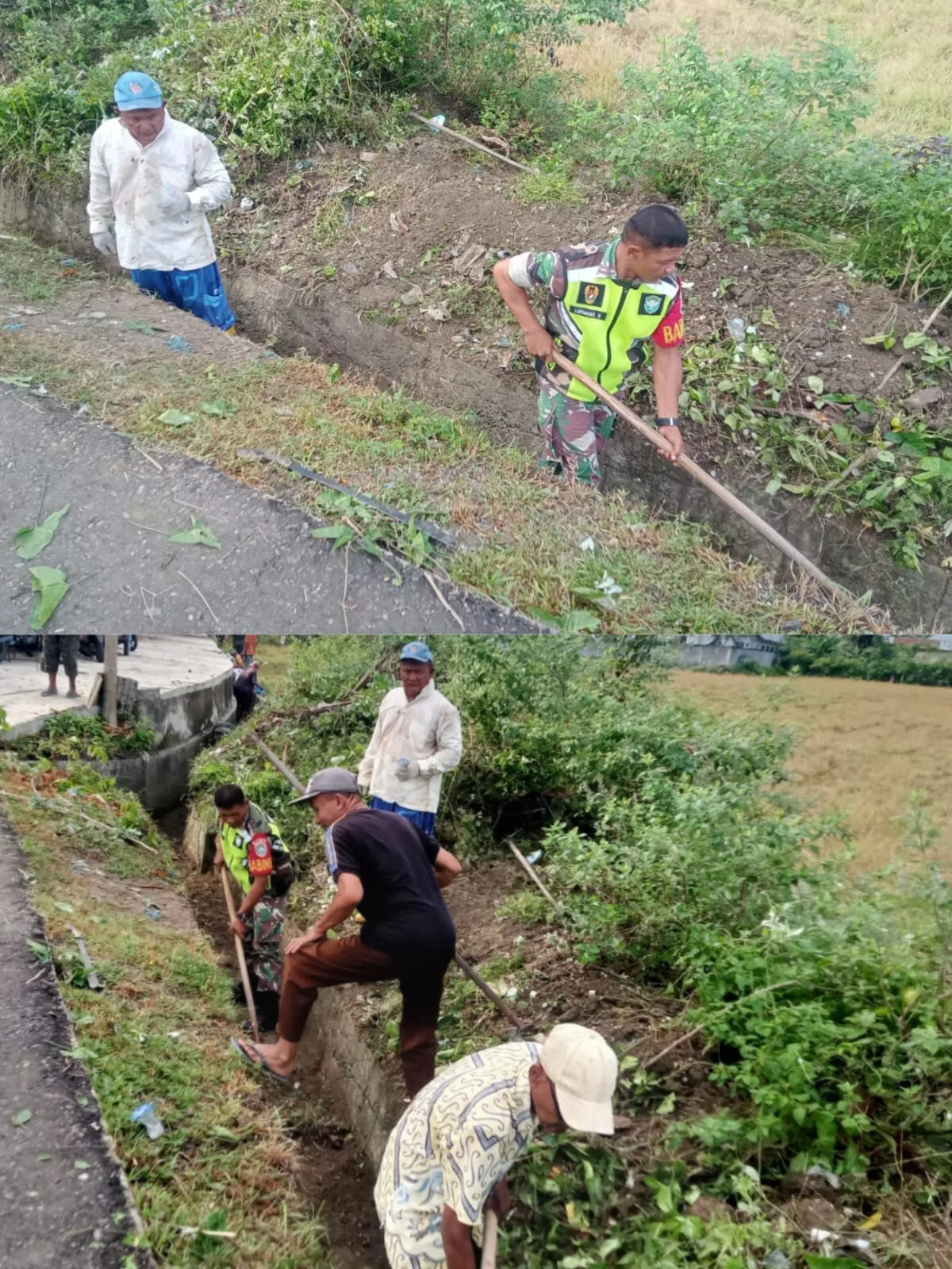 Sejak pagi hari, warga bersama Babinsa terlihat bahu membahu membersihkan parit dengan menggunakan peralatan sederhana seperti cangkul, sekop, dan parang.