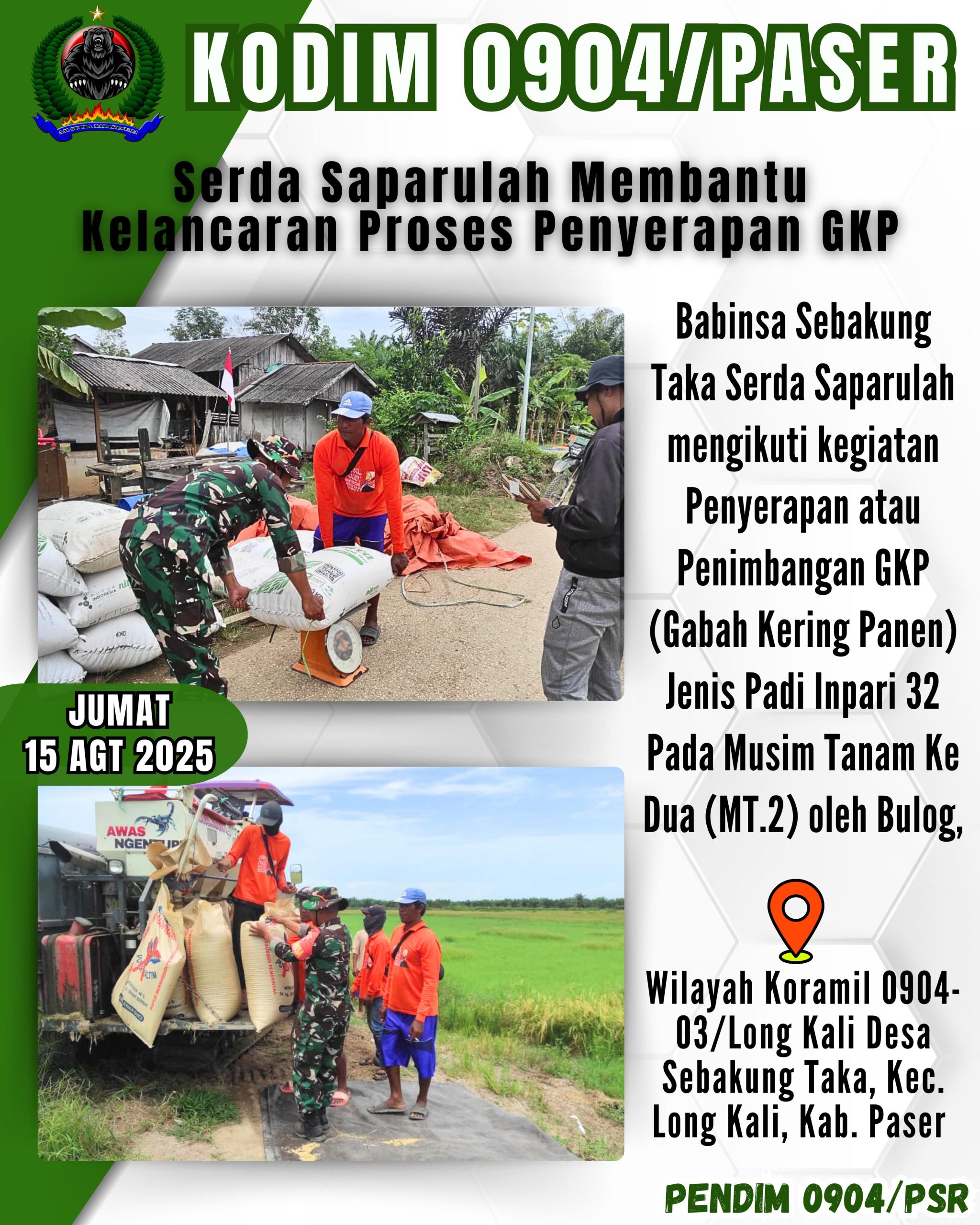 Kodim 0904/Psr, Korem 091/ASN, Kodam VI/Mlw – Bertempat di wilayah Koramil 0904-03/Long Kali Desa Sebakung Taka, Kec. Long Kali, Kab. Paser Serda Saparulah mengikuti kegiatan Penyerapan atau Penimbangan GKP (Gabah Kering Panen) Jenis Padi Inpari 32 Pada Musim Tanam Ke Dua (MT.2) oleh Bulog, Jumat (15/8/2025).