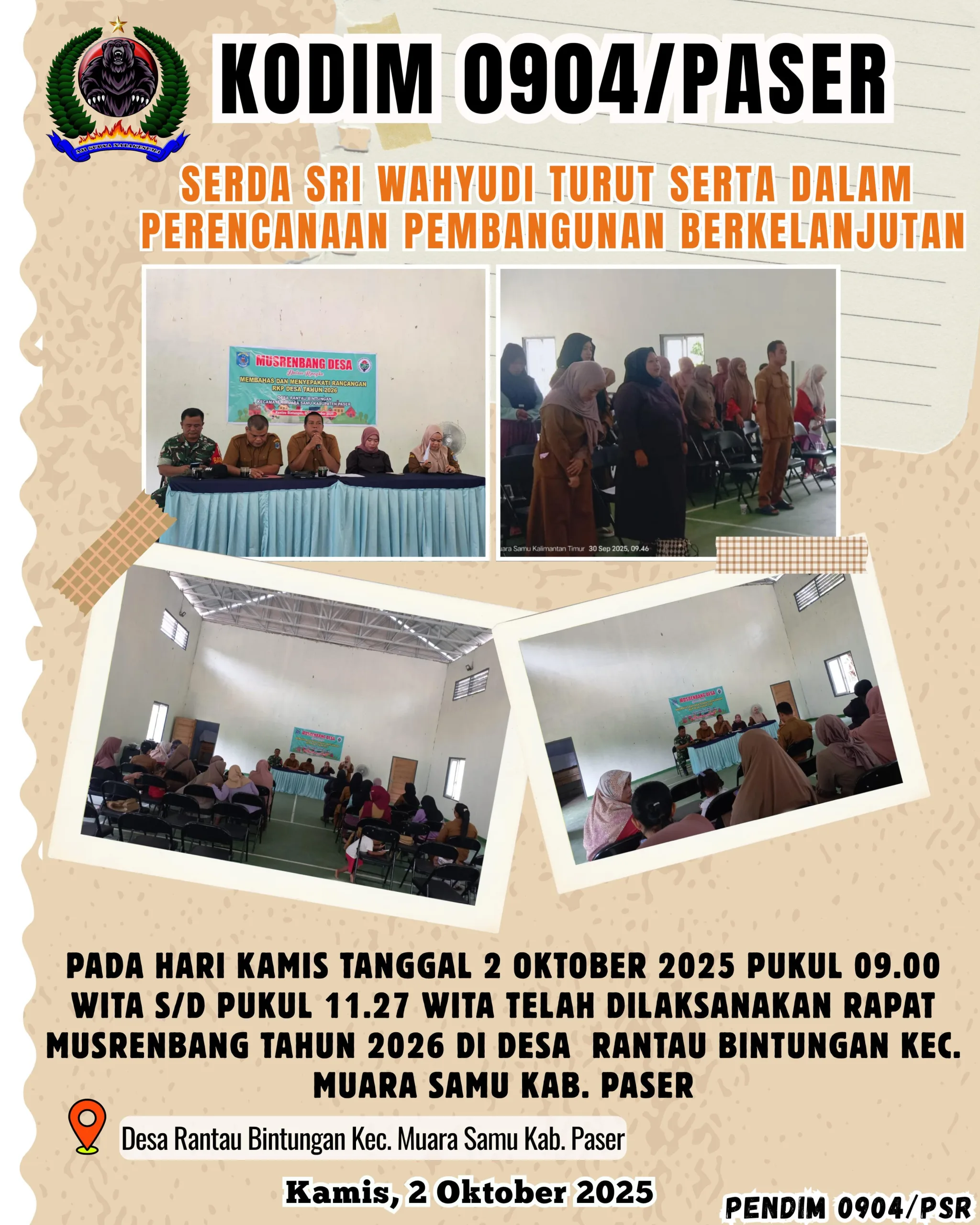 Kodim 0904/Psr, Korem 091/ASN, Kodam VI/Mlw – Pada Hari Kamis tanggal 2 Oktober 2025 pukul 09.00 Wita s/d pukul 11.27 Wita telah dilaksanakan Rapat Musrenbang Tahun 2026 di Desa Rantau Bintungan Kec. Muara Samu Kab. Paser, Kamis (2/10/2025).