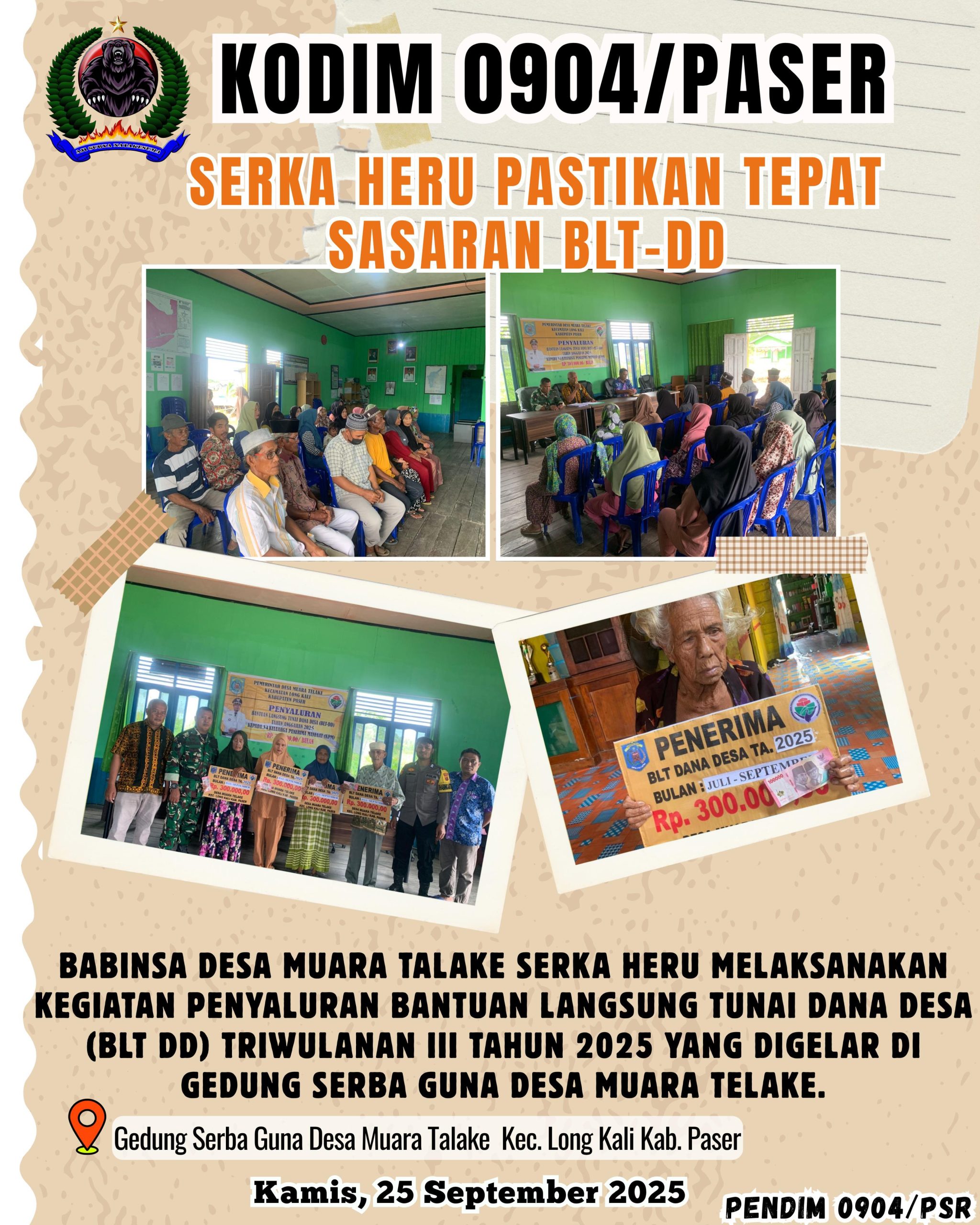 Kodim 0904/Psr, Korem 091/ASN, Kodam VI/Mlw – Babinsa Desa Muara Talake Serka Heru melaksanakan kegiatan penyaluran Bantuan Langsung Tunai Dana Desa (BLT DD) Triwulanan III Tahun 2025 yang digelar di gedung serba guna Desa Muara Talake, Kamis (25/9/2025).