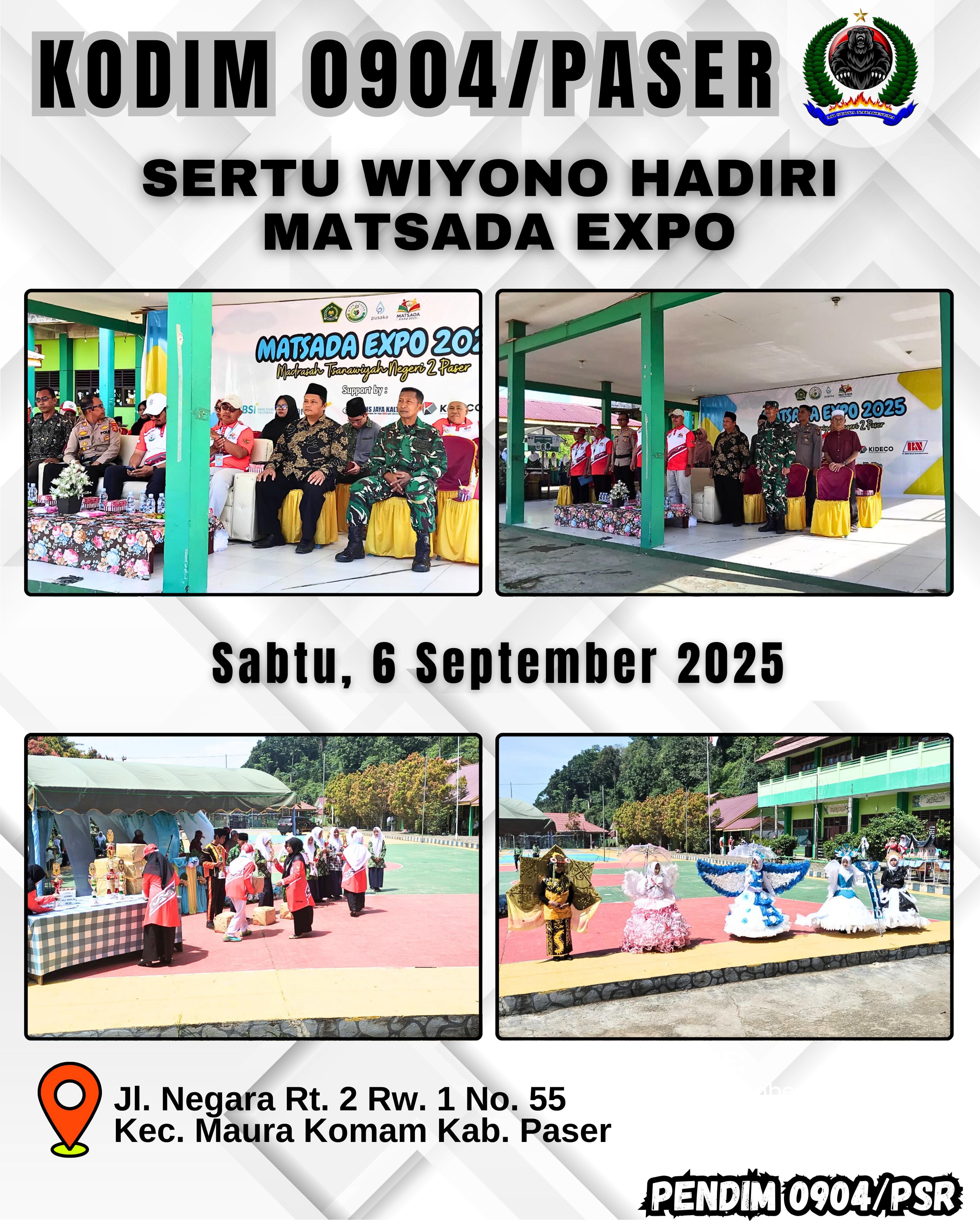 Kodim 0904/Psr, Korem 091/ASN, Kodam VI/Mlw – MTS N 2 Paser menggelar penutupan Matsada Expo di lapangan MTS N 2 Paser Jl. Negara Rt. 2 Rw. 1 No. 55 Kab. Paser, Sabtu (6/9/2025).