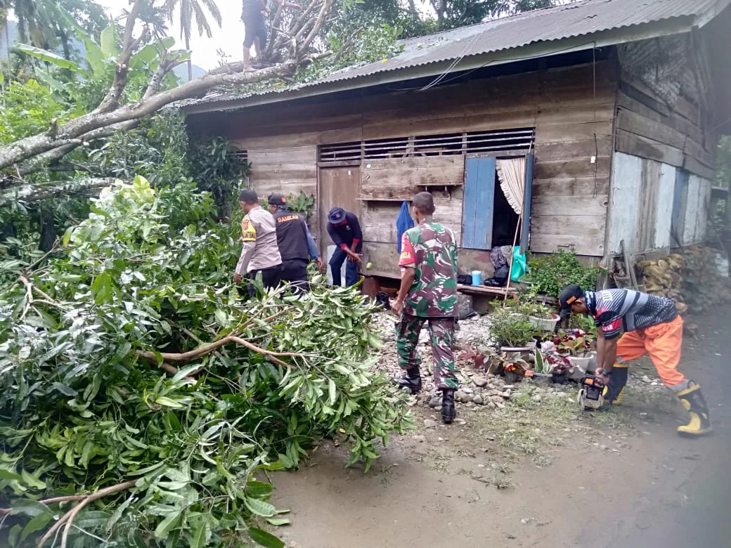 ‎Tak lama setelah laporan diterima, personel Koramil 03/Meukek, Polsek Meukek, dan Damkar Pos Meukek langsung bergerak cepat ke lokasi. Di bawah komando Serma Edi Syahputra, Aipda Zai dan Wahid dari tim Damkar, mereka bahu-membahu mengevakuasi batang pohon besar yang menimpa rumah warga.