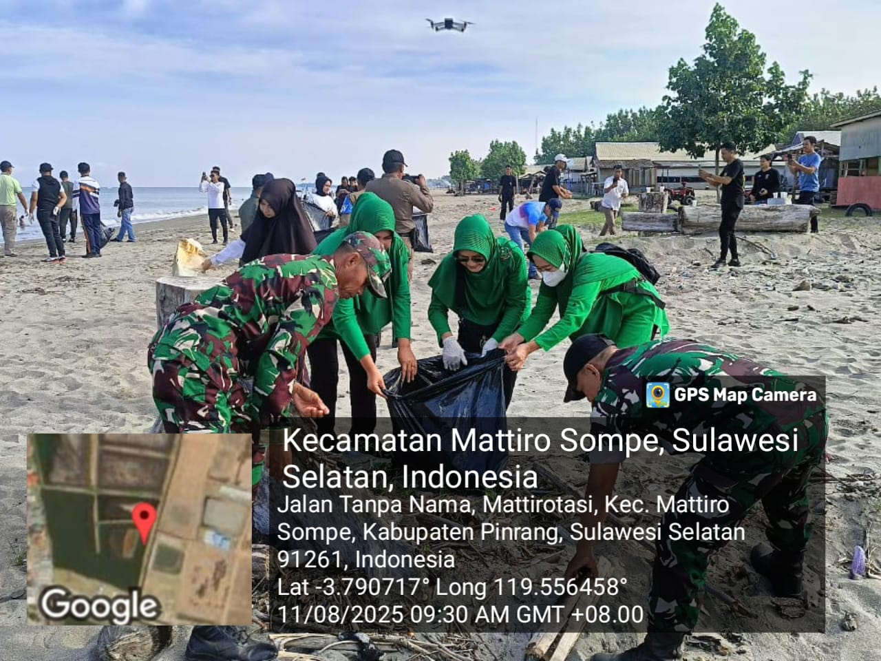 Pinrang_ Sinergitas 3 pilar yakni Babinsa Jajaran Koramil-02/Mattiro Sompe Kodim 1404/Pinrang, Bhabinkamtibmas jajaran Polsek Mattiro Sompe, Staf Kecamatan dan Desa serta masyarakat melaksanakan kegiatan pelestarian alam dengan melakukan pembersihan pantai wisata Ammani di Desa Mattiro Tasi Kecamatan Mattiro Sompe Kabupaten Pinrang, Senin (11/08/2025).
