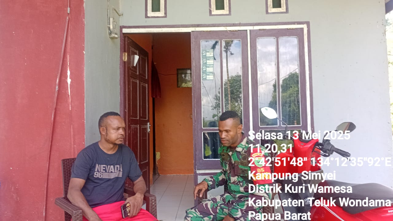 Pada hari Selasa, 13 Mei 2025, Babinsa Koramil 1811-01/Wasior, Prada Alfonsus Samberi, menggelar anjangsana di Kampung Simeyi, Distrik Kuri Wamesa, Kabupaten Teluk Wondama, dengan tujuan memperkuat sinergitas antara TNI dan masyarakat.