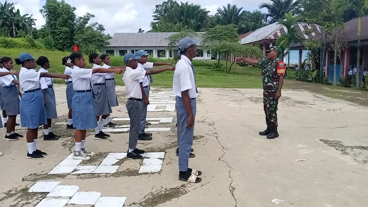 Bintara Pembina Desa (Babinsa) Koramil 01/Teminabuan Kodim 1807/Sorsel Serda Dimara memberikan pelatihan Peraturan Baris Berbaris (PBB) kepada siswa-siswi SMA Negeri Saifi Distrik Syaifi Kab Sorsel. Kamis (30/07/2025).