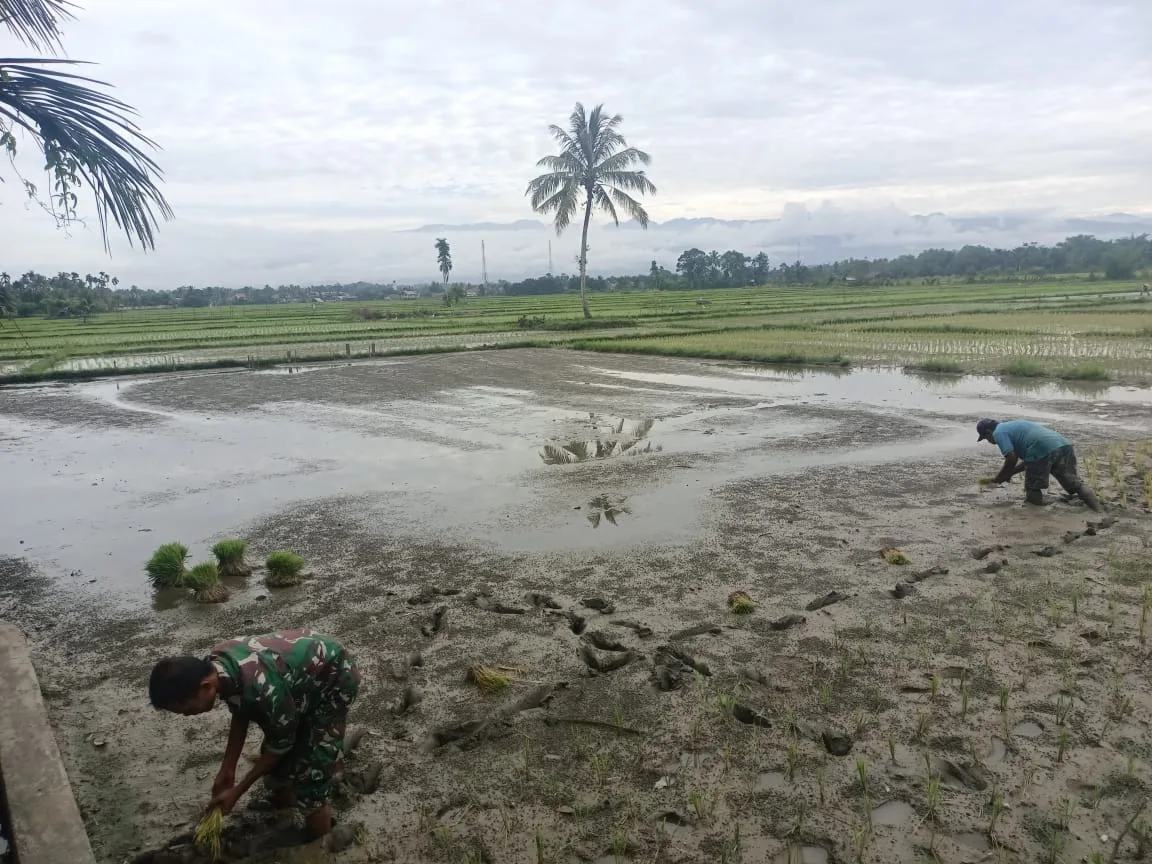 Nagan Raya– Babinsa Koramil 03/Senagan Timur, Kodim 0116/ Nagan Raya, Kopda Said AR turun langsung ke sawah membantu petani desa binaan menanam padi bertempat di persawahan Desa Peulekung, Kecamatan Senagan Timur, Kabupaten Nagan Raya. Kamis, (27/11/2025).