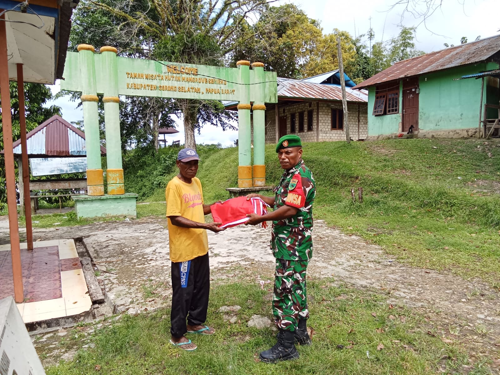 Bintara Pembina Desa (Babinsa) Koramil 1807-01/Teminabuan Serda Theo Dimara turun ke wilayah binaan di Kampung sayal Distrik Syaifi Kab Sorong Selatan guna membagikan bendera merah putih secara cuma” kepada warga binaannya Sabtu 09/08/2025.