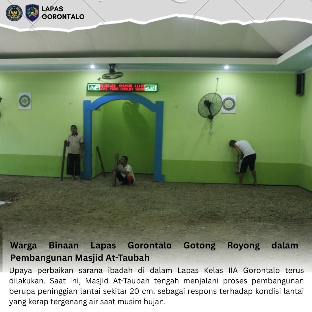 Gorontalo – INFO_PAS – Upaya perbaikan sarana ibadah di dalam Lapas Kelas IIA Gorontalo terus dilakukan. Saat ini, Masjid At-Taubah tengah menjalani proses pembangunan berupa peninggian lantai sekitar 20 cm, sebagai respons terhadap kondisi lantai yang kerap tergenang air saat musim hujan.