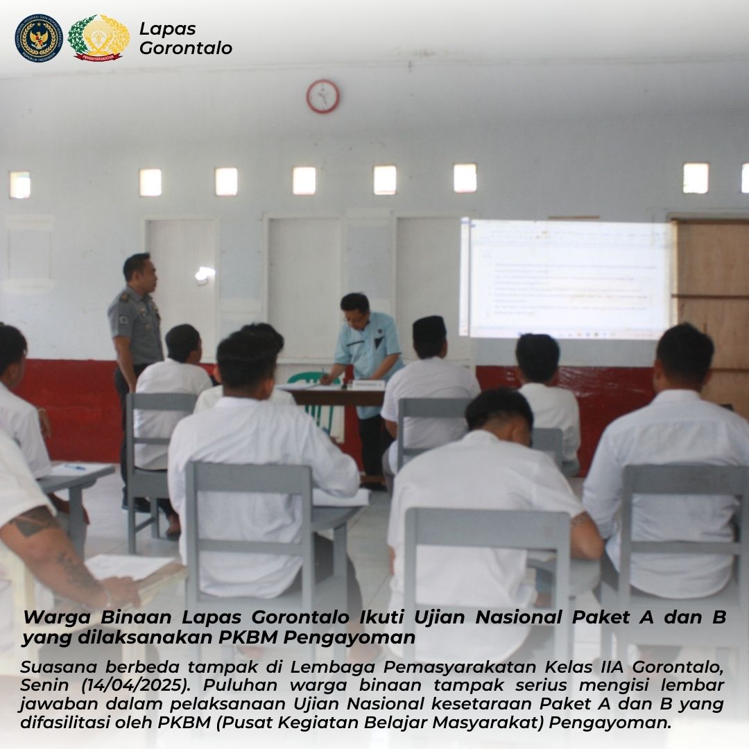 Gorontalo – Suasana berbeda tampak di Lembaga Pemasyarakatan Kelas IIA Gorontalo, Senin (14/04/2025). Puluhan warga binaan tampak serius mengisi lembar jawaban dalam pelaksanaan Ujian Nasional kesetaraan Paket A dan B yang difasilitasi oleh PKBM (Pusat Kegiatan Belajar Masyarakat) Pengayoman.