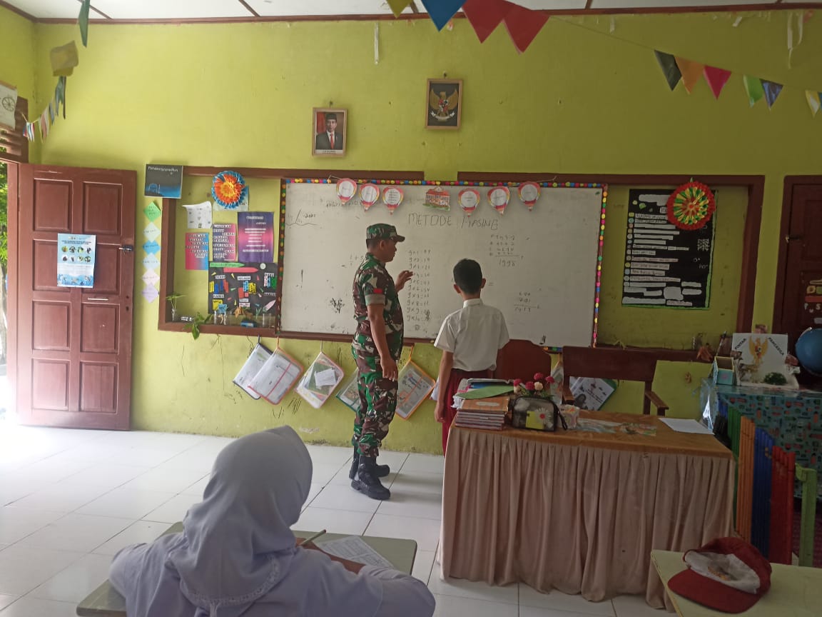 Simeulue – Babinsa Koramil 03/Teupah Selatan Kodim 0115/Simeulue Praka Darsmansyah melaksanakan Wawasan Kebangsaan (Wasbang) dengan memberikan materi Matematika metode Gasing kepada siswa-siswi SD Negri 7 di Desa Alus-Alus Kec. Teupah Selatan, Senin (14/04/2025).