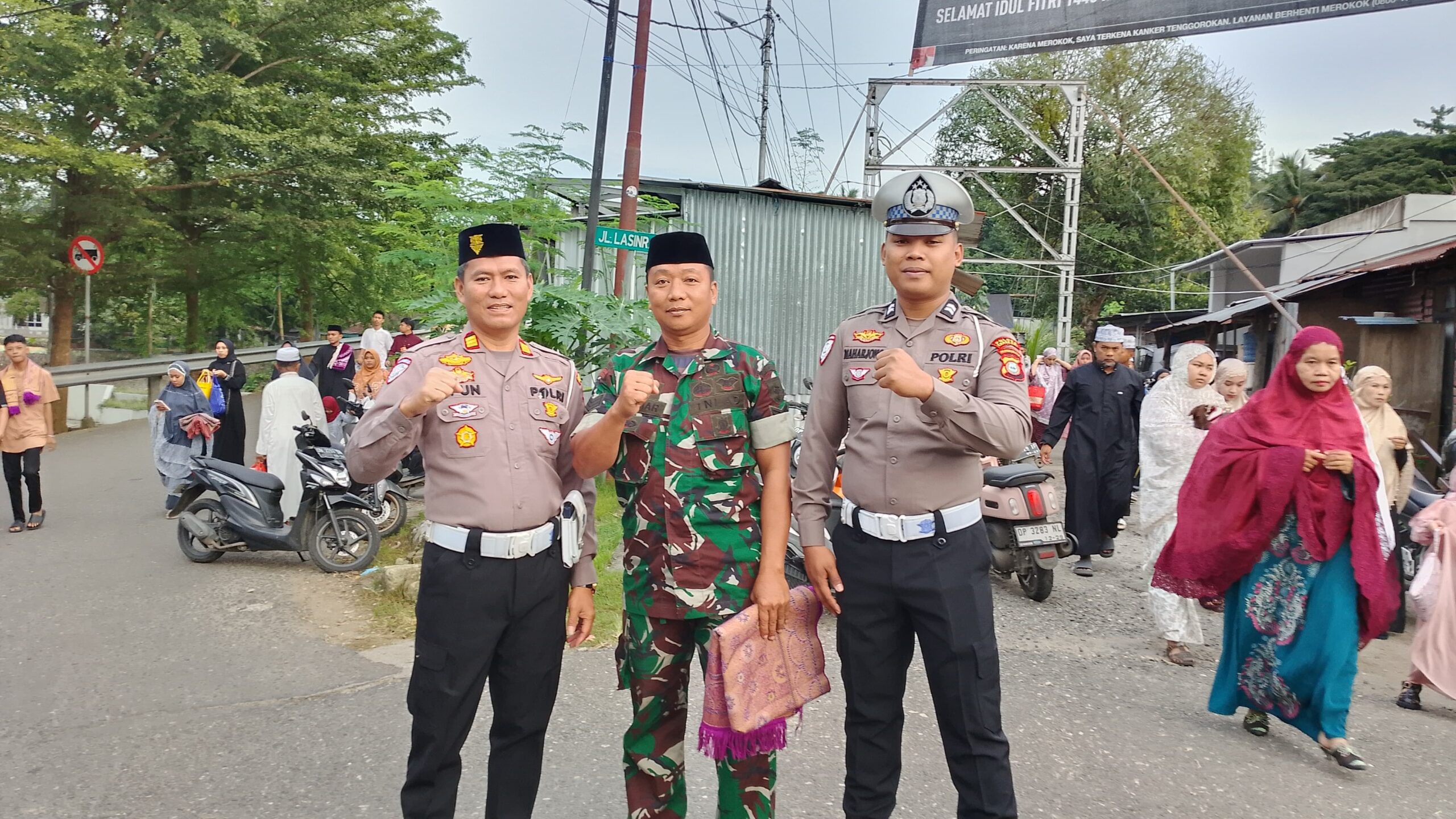Dalam pengamanannya, terlihat Babinsa mengatur arus lalu lintas yang mana merupakan jalan utama serta pengamanan ibadah Sholat Idul Adha berlangsung.