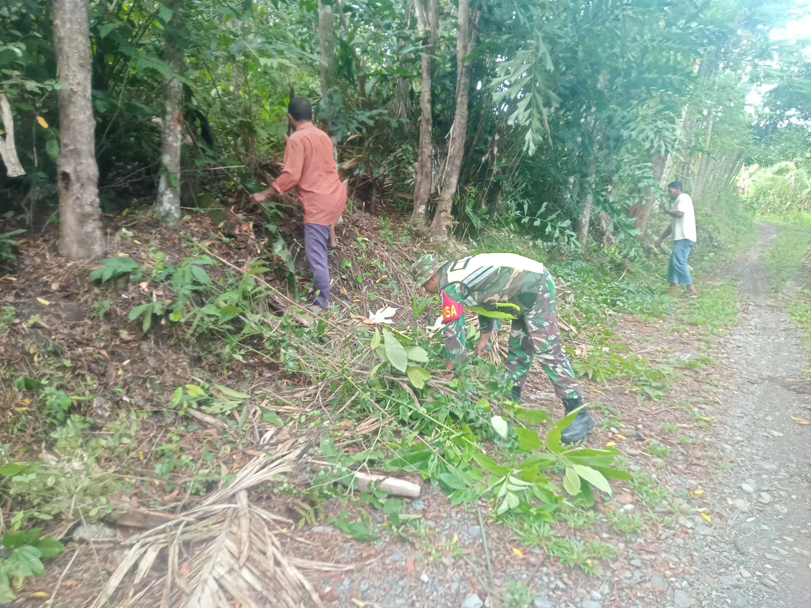 Kegiatan gotong royong tersebut difokuskan pada pembersihan semak belukar dan material alami yang selama ini menutupi serta menghambat akses jalan ke kebun warga.