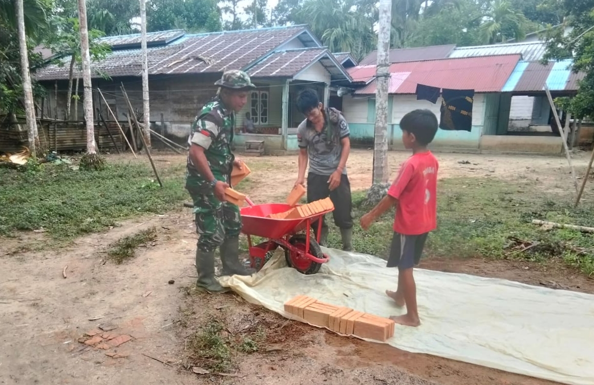 Babinsa Koramil 04/Salang, Kodim 0115/Simeulue, Korem 012/Teuku Umar. Praka Ikwanul Akrab membantu warga memindahkan batu bata yang mana nantinya akan di jadikan bahan untuk membuat Warung kecil yang di rencanakan di buat di depan rumah di Desa Lala bahagia, Kecamatan Salang, Kabupaten Simeulue. Kamis (12/06/2025).