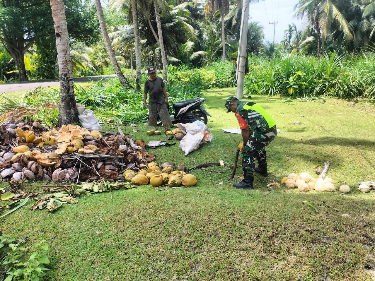 Simeulue – Babinsa Koramil 03/Teupah Selatan Kodim 0115/Sml membantu Bapak Usman mengupas kelapa yang baru saja dipanen bertempat di Desa Trans Baru Kecamatan Teupah Selatan kabupaten Simeulue Sabtu (09/06/2025).
